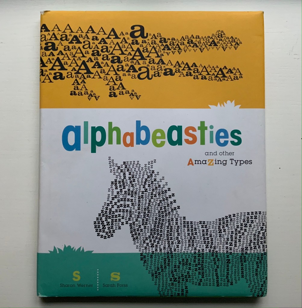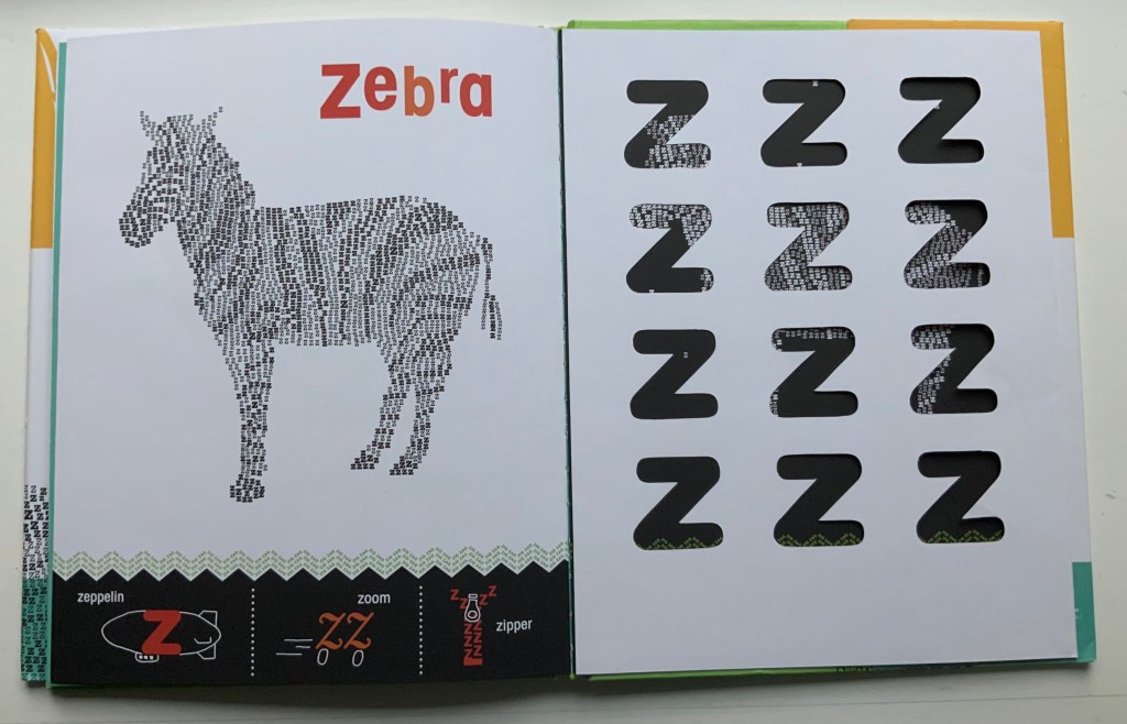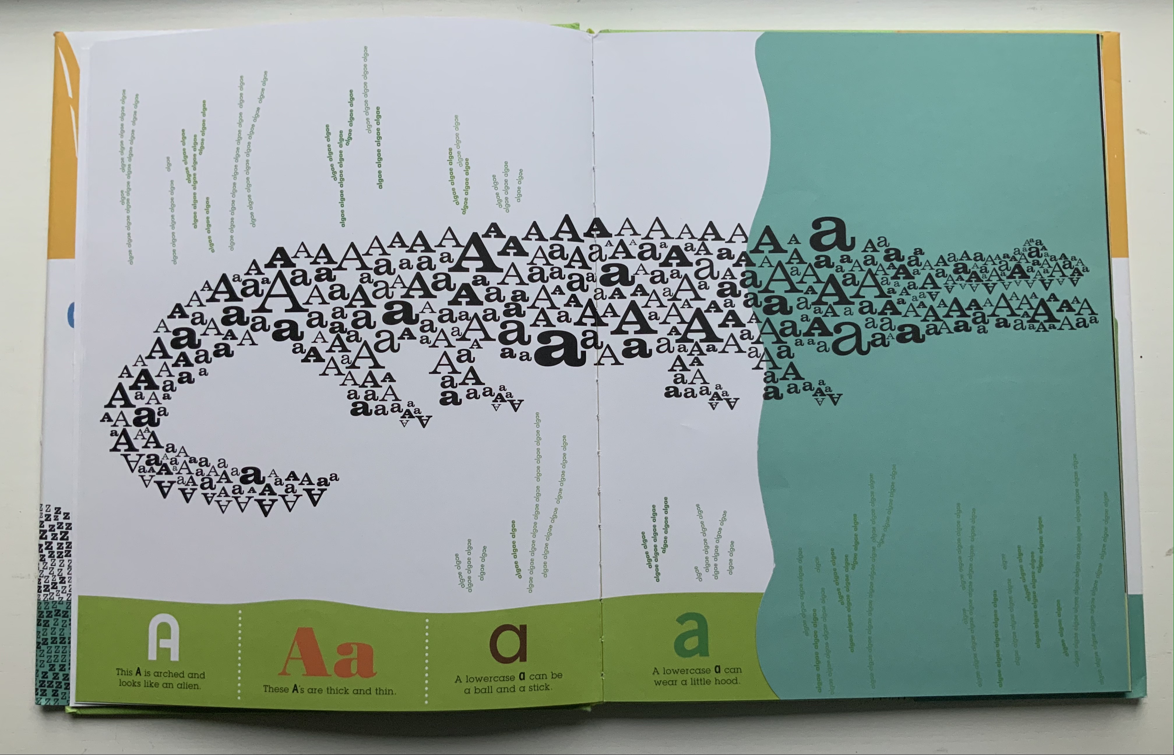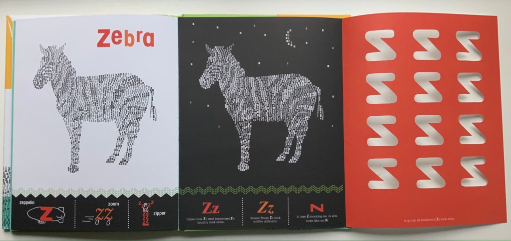 Unlike Roberto de Vicq de Cumptich’s Bembo’s Zoo (2000), this book relies on numerous type faces with which to create its alphabeasties, posed above the book’s illustratively shaped chiron that also provides the running information about “other amazing types”. Information is also conveyed from under flaps, through cutouts, across foldouts and by background images constructed of words.