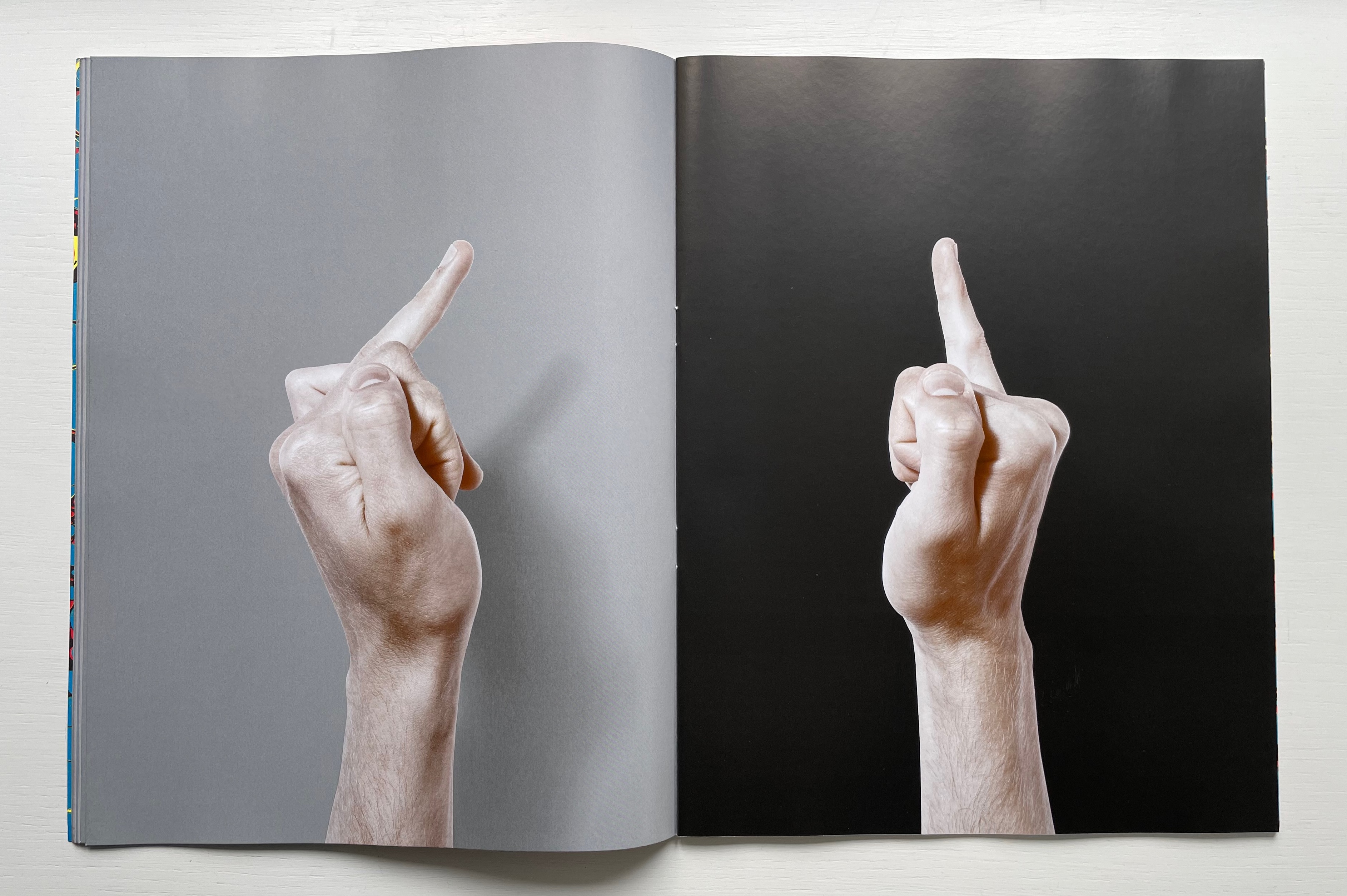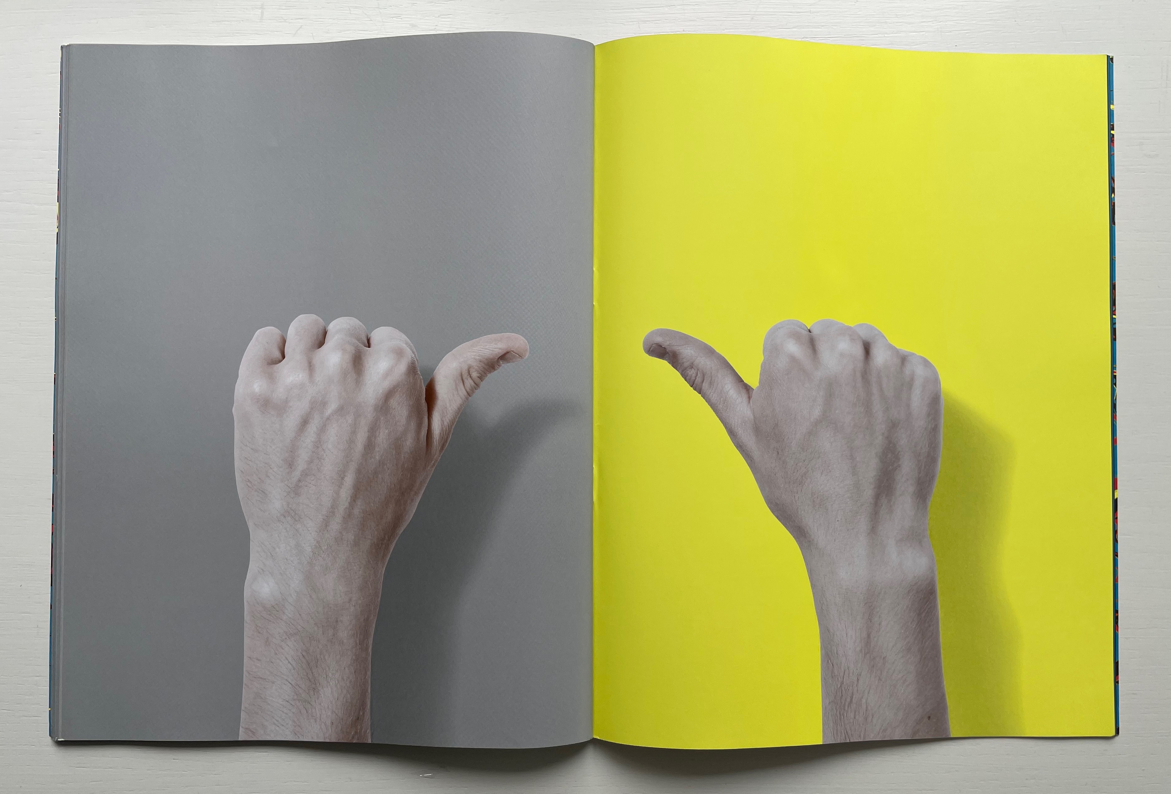 The marbled cover and diagram’s explanation draw attention to a sort of noise reduction feature — color. The left hand always appears against a gray background; the right appears against a colored background. Where there might be some difficulty in distinguishing the fourth digit from the fifth in their side views, the colors bright blue and black are helpful.