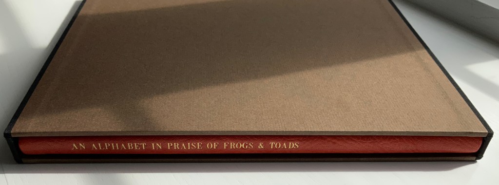 Among the subgenres of alphabet books, the animal abecedary reigns. From the animal kingdom, though, frogs and toads are not the highest ranking of the sub-subgenres. Among artists’ books from fine presses, however, this counts among the finest in the Books On Books Collection. Norris Wood drew from life, but it is hard to credit that all 26 of these creatures inhabited his bedroom!