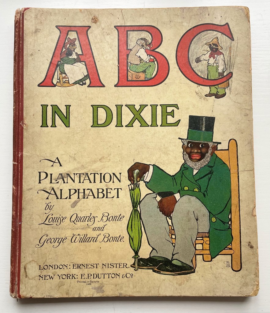 ABC in Dixie is here for its representation of how alphabets construct a world view. It is also here to be confronted with other world views. Rather than being coddled among rosy-cheeked children’s books — as it once was in Ernest Nister’s catalogue — ABC in Dixie sits here to be discomfited by American Alphabets (2005) by Wendy Ewald, Mourning/Warning (2015) by Tia Blassingame, Transforming Hate (2016) by Clarissa Sligh, R is for Reparations (2019) by the Global Afrikan Congress, The Modern Day Black Alphabet (2020) by Arial Robinson and Ein rassismuskritisches Alphabet (An Anti-Racist Alphabet) (2022) by Tupoka Ogette. By way of apology, if these other world views are seen alongside that of ABC in Dixie, maybe the arc of history can be bent a bit further toward justice a bit sooner.