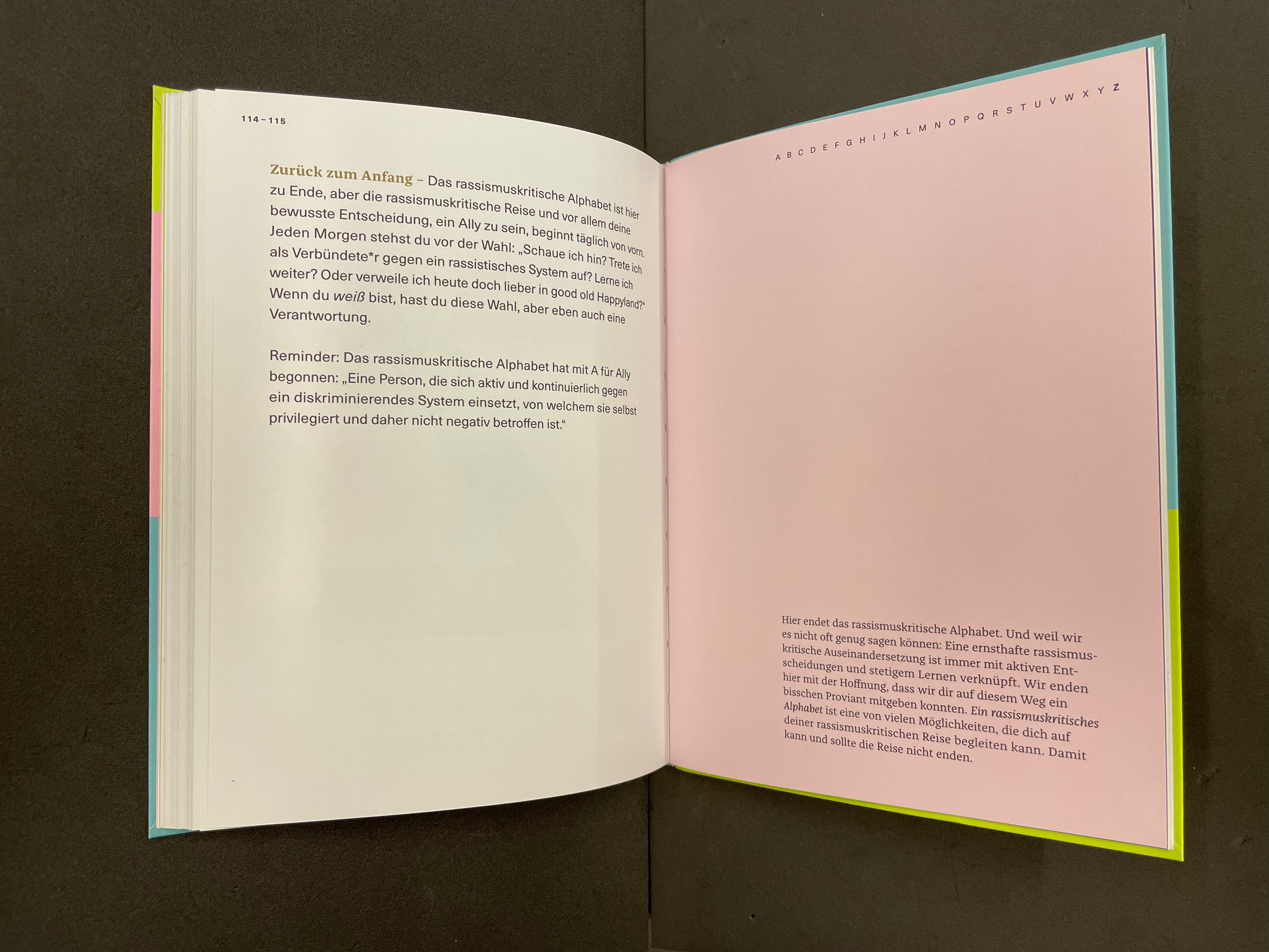 “The anti-racist alphabet ends here, but the anti-racist journey, and especially your conscious decision to be an Ally, begins anew every day. Every morning you face the choice: Am I looking? Do I stand up as an ally against a racist system? Do I continue to learn? Or do I stay in good old Happyland today? If you are White, you have that choice, but you also have a responsibility.
