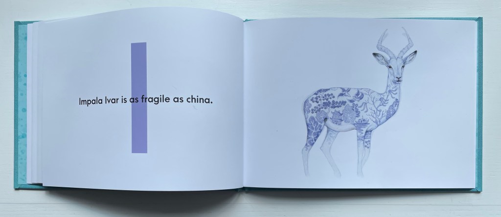 Adding to the humor are other incongruities such as a paisley-patterned dingo and a camouflaged goat. The many half- or near-rhymes also enhance the humor: “Elephant Etta looks good in a sweater” and “Impala Ivar is as fragile as china”).
