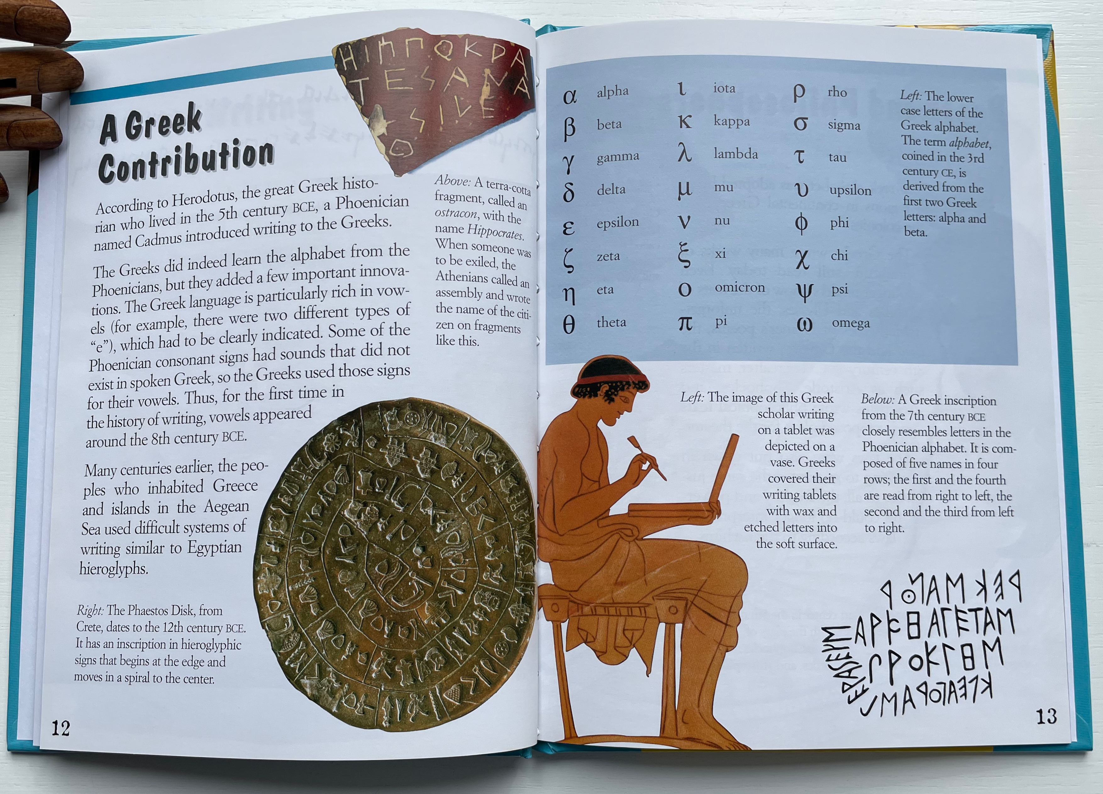 Adding the other three volumes’ 96 pages does not overcome the challenge. Taken together, the disparate stories — that writing was a gift from the gods, that writing evolved from numbers and accounting, that only some writing systems generated alphabets, that alphabets changed with the tools and materials to hand — offer an entertaining montage of snippets that could lead a curious mind to be more curious.