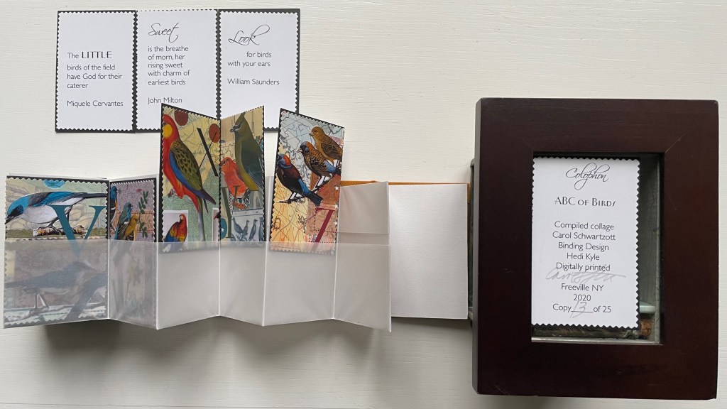 Carol Schwarztott, ABC of Birds (2020). A curious mix of traditions: Cornell box, stamp art, leporello, miniature and pocket pages.