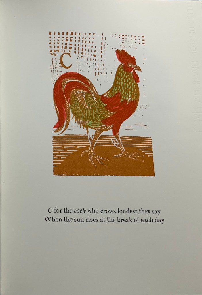 Alan James Robinson and Suzanne Moore, A Fowl Alphabet (1986).* A superb collaboration between an engraver (Robinson) and calligrapher (Moore).