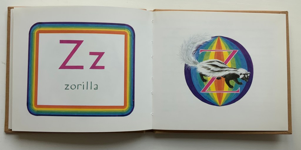 Michele Durkson Clise, Animal Alphabet: Folding Screen (1992) wrongfoots the reader with animal images that do not align with the expected alphabet letter or the letters of the first words in the leporello’s rhyming couplets. If the image does at least align with a word in the couplet (e.g., “whale”), that word’s first letter does not align with the alphabet letter expected for that panel.