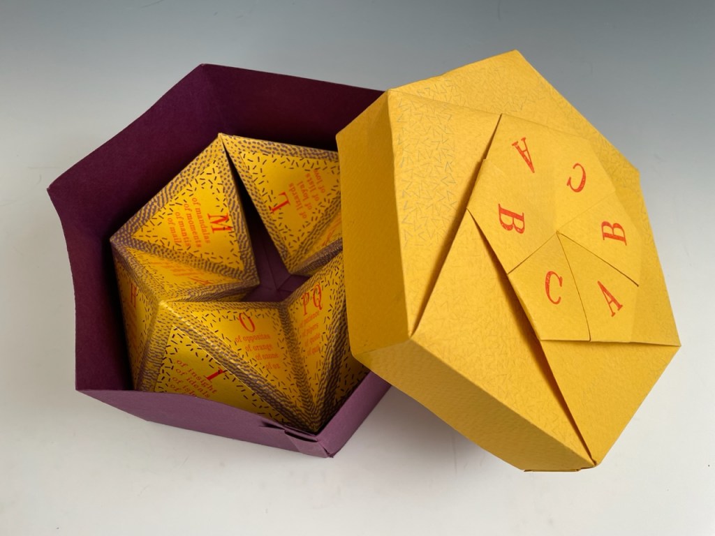 Kathleen Amt, Kaleidoscopic ABC’s (1991)*. What rests inside the paper box is a flexagon, six paper pyramids bound together to create a “fidget toy” alphabet book of 24 “pages” (4 panels x 6 pyramids) to be read by turning it inside out again and again. Look for the tricky panel page at the end.