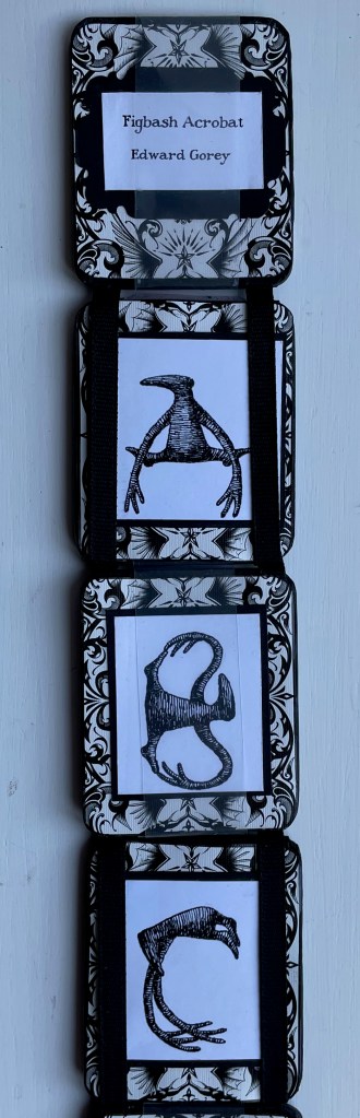 Patrice Miller (Edward Gorey), Figbash Acrobate (2023). In progress Likewise the tumbling Jacob’s ladder structure is perfect for reading the Figbash acrobats as they bend and twist into the shapes of the letters. See also “Alphabets Alive! B is for Bodies”.
