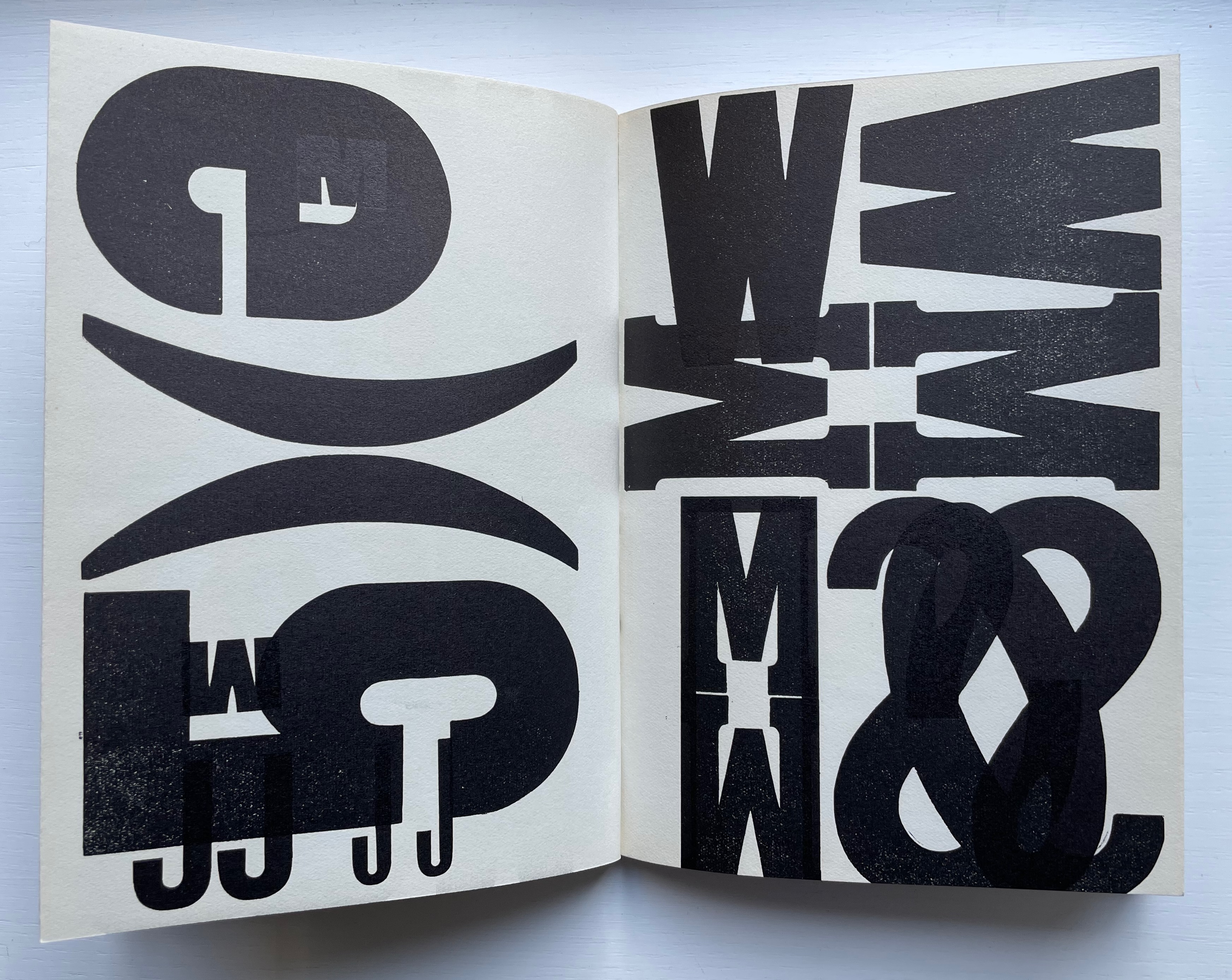 Slipcased, self-covered leporello with eighteen original woodcuts of stylized apes and sixteen typographical experiments. H450 x W335 mm. 36 unnumbered sheets. Edition of 300, of which this is #68. Acquired from Winterberg-Kunst, 22 October 2022.