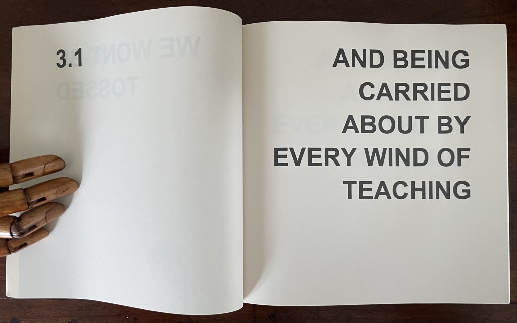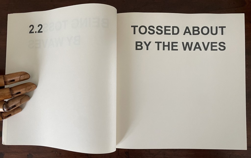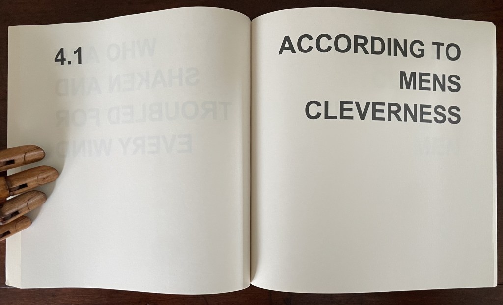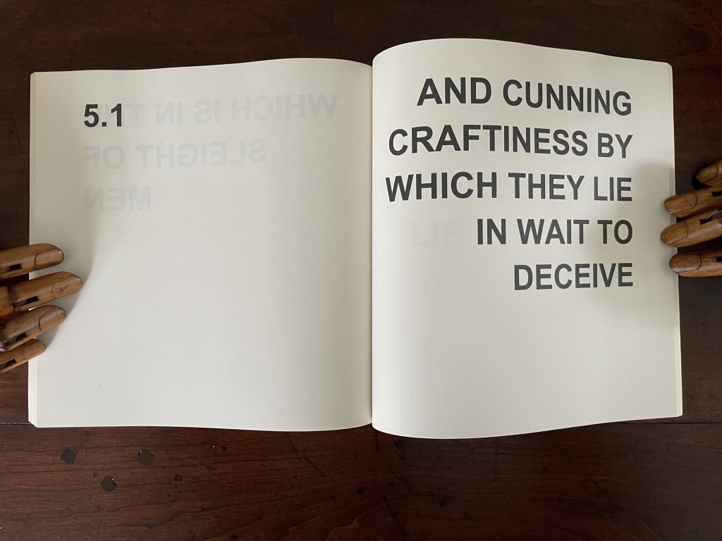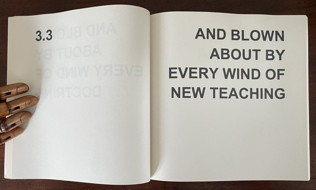 In its titling, Various Versions signals Ed Ruscha’s Various Small Fires and Milk (1970) but strongly deviates from it by using nothing but text. Given that its text is an extended deconstruction of Ephesians 4:14 from the New Testament, it is a strong move from an icon of the “pictorial turn”. Art built purely on complete text — not just the introduction of letters or words à la Picasso nor concrete poetry à la Gomringer — has plenty of practitioners. Think of Jenny Holzer, Christopher Wool, Ian Hamilton Finlay and many others. When it comes to book artists who use a complete text as Bigland has, the list shortens. Think of Christian Bök, Elisabeth Tonnard, but who else? Chapbooks and the like would likely sidetrack the search. So, too, would those artists books that erase, patch over or re-order a complete text à la Jérémie Bennequin, Jonathan Safran Foer or Mikko Kuorinki.