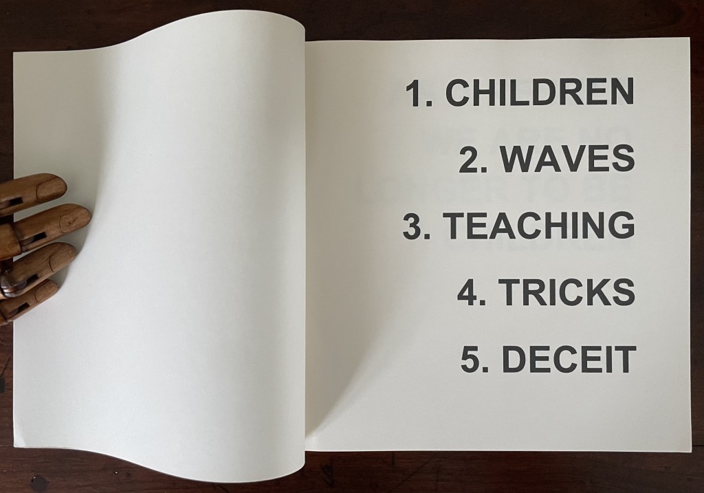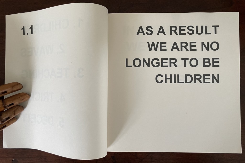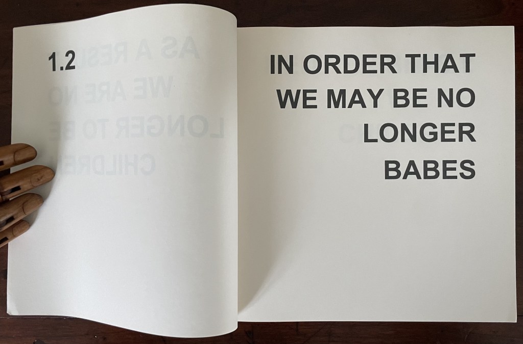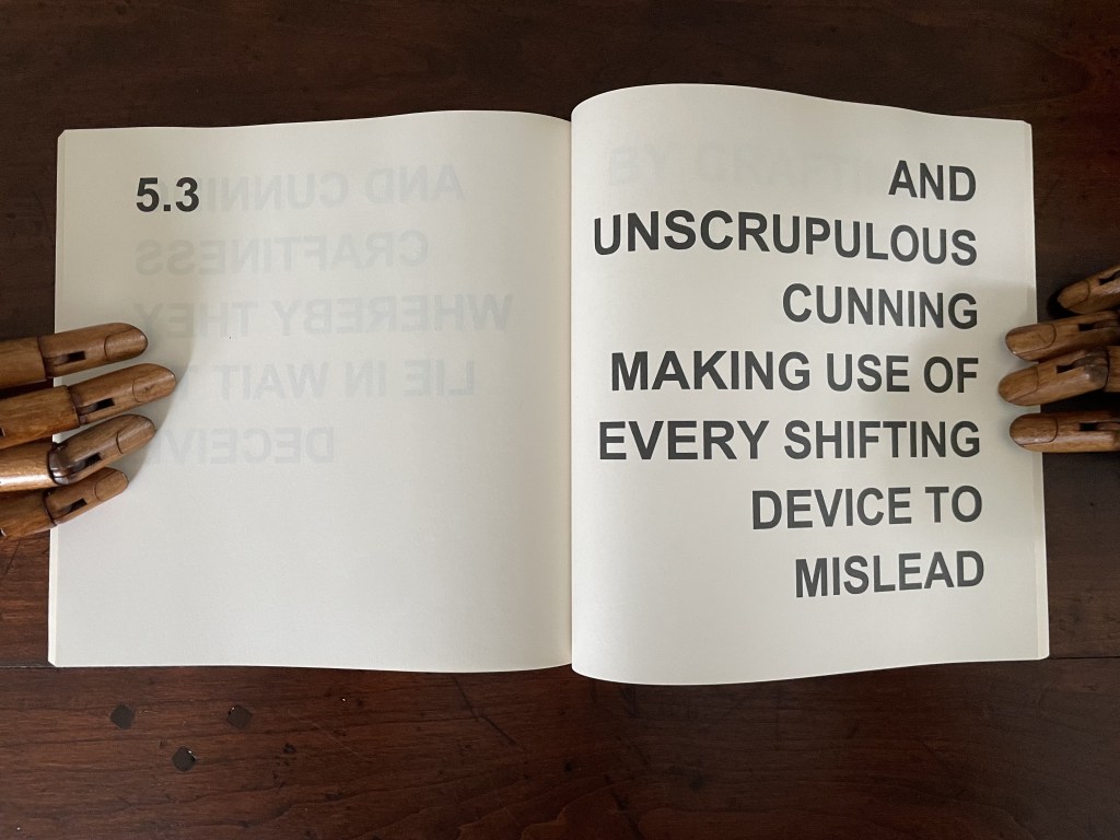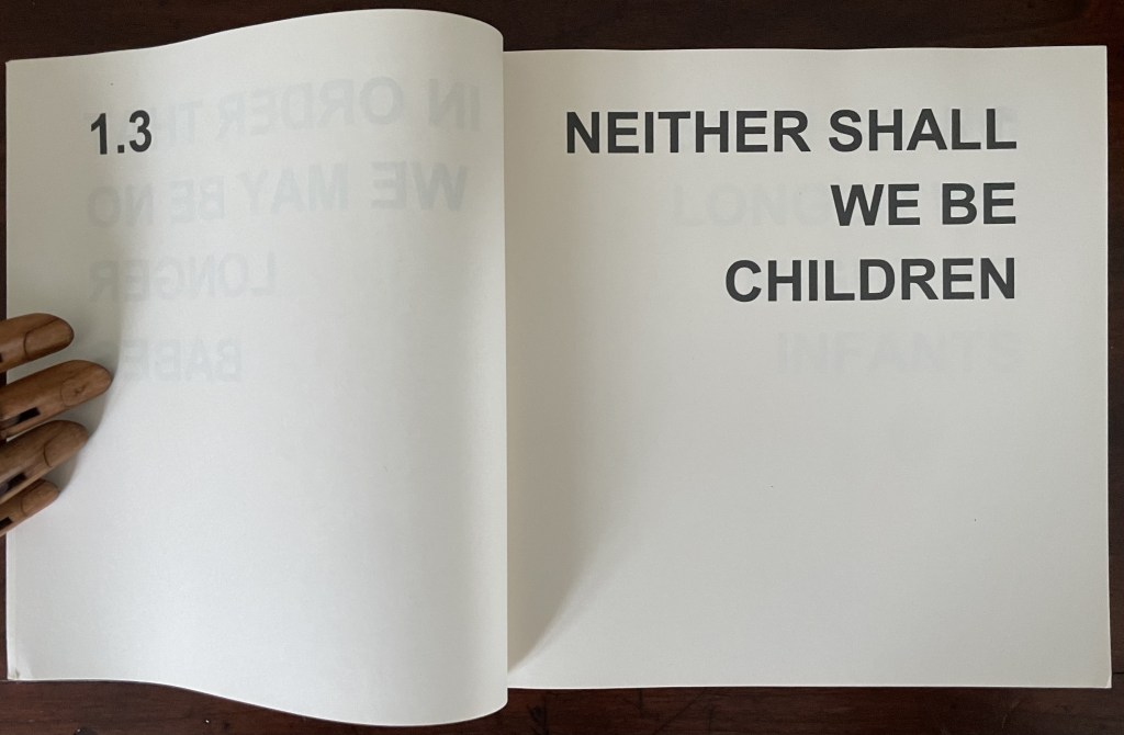 In its titling, Various Versions signals Ed Ruscha’s Various Small Fires and Milk (1970) but strongly deviates from it by using nothing but text. Given that its text is an extended deconstruction of Ephesians 4:14 from the New Testament, it is a strong move from an icon of the “pictorial turn”. Art built purely on complete text — not just the introduction of letters or words à la Picasso nor concrete poetry à la Gomringer — has plenty of practitioners. Think of Jenny Holzer, Christopher Wool, Ian Hamilton Finlay and many others. When it comes to book artists who use a complete text as Bigland has, the list shortens. Think of Christian Bök, Elisabeth Tonnard, but who else? Chapbooks and the like would likely sidetrack the search. So, too, would those artists books that erase, patch over or re-order a complete text à la Jérémie Bennequin, Jonathan Safran Foer or Mikko Kuorinki.