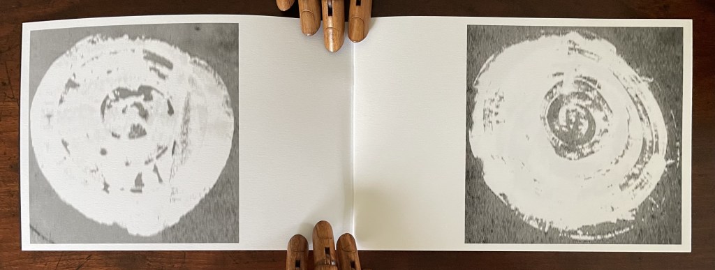 It would be difficult and risky to take photos of roundabouts from directly overhead, and in a photograph from the roadside, the roundabouts would appear elliptical, and the tarmac frame would look like a rhomboid. If a bit of renaming can make that transformation, why not a bit of manipulation of the axis to yield “square” photographs and circularized ellipses? In doing just that and framing the results within and around the covers, Bigland delivers a variation on several themes in book art. Interrogating the form of the book. Setting a creative tension between words and image. Conflating techniques (photography, painting and book design). Echoing, modulating and transforming the traditions of book art.