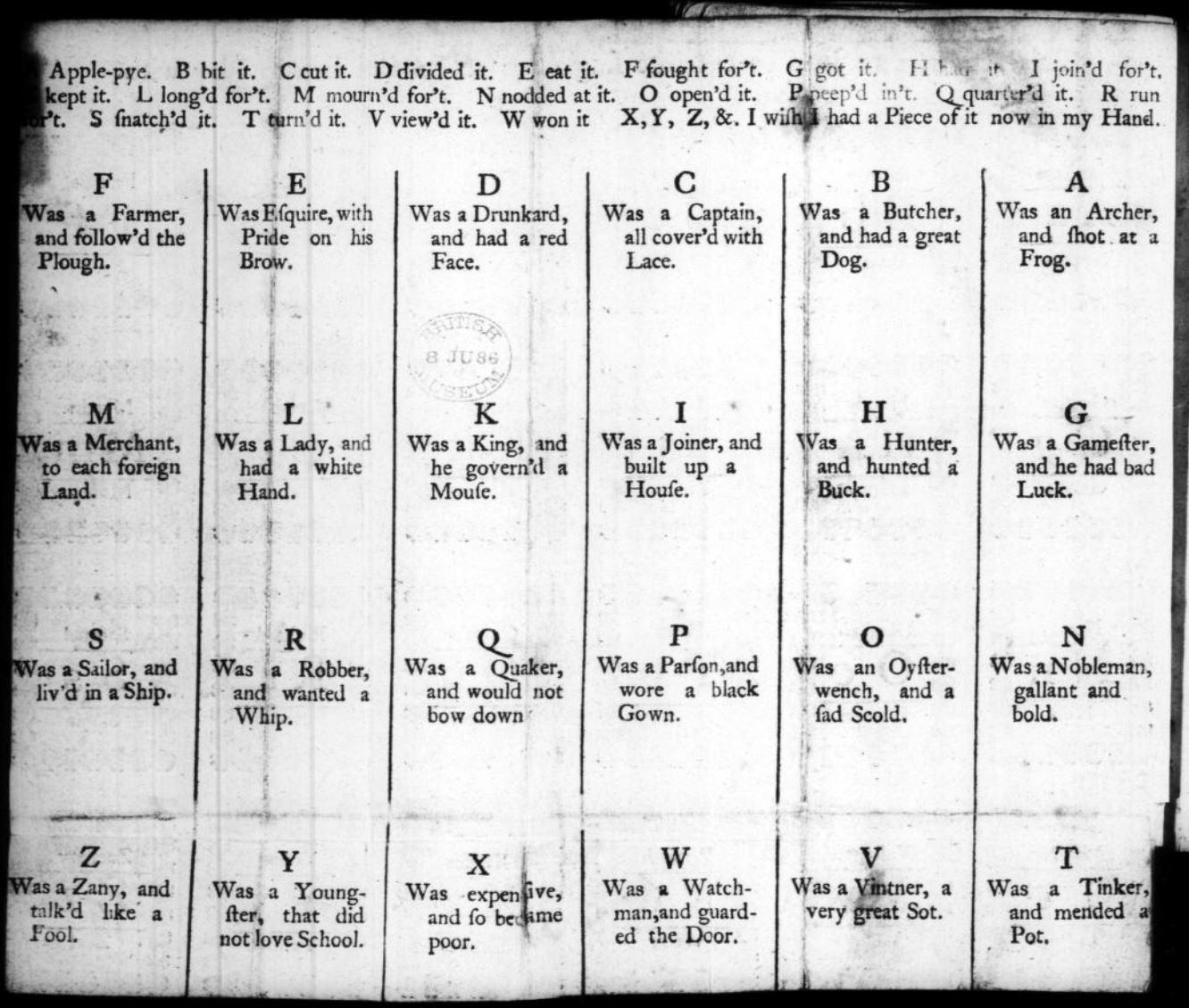1764. Tom thumb’s play-book : to teach children their letters as soon as they can speak. London. Contains “A Apple Pie” as well as “A was an Archer“.