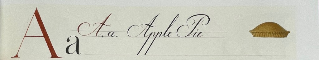 Further drawing attention to the art of illustrating the alphabet, not only does Spirin hand-draw examples of their forms in print and calligraphy, he leaves the guidelines for the base and x-height in place, eliminating them after (or before?) using them as the measure for the base and crust of a miniature pie in the margin. In a sense, the process of lettering has also become the canvas for A Apple Pie.