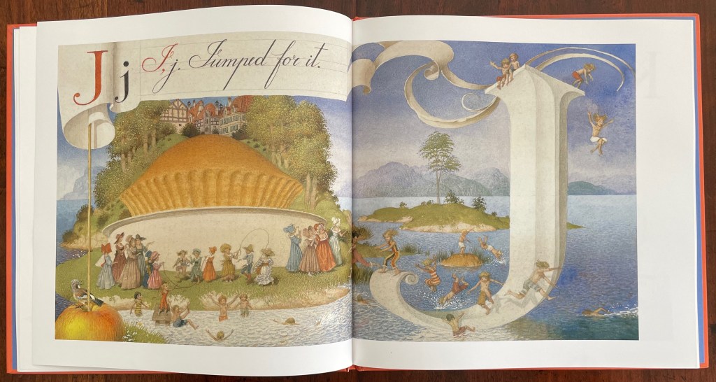 Letters other than A have images that cross the divide of pages. When they do, Spirin’s historical influences ranging from the medieval to the Renaissance to the Victorians stand out even more. His play with figures, color, perspective and shadow in the letter J pages recall Brueghel, Bosch, Patinir and, of course, Kate Greenaway.