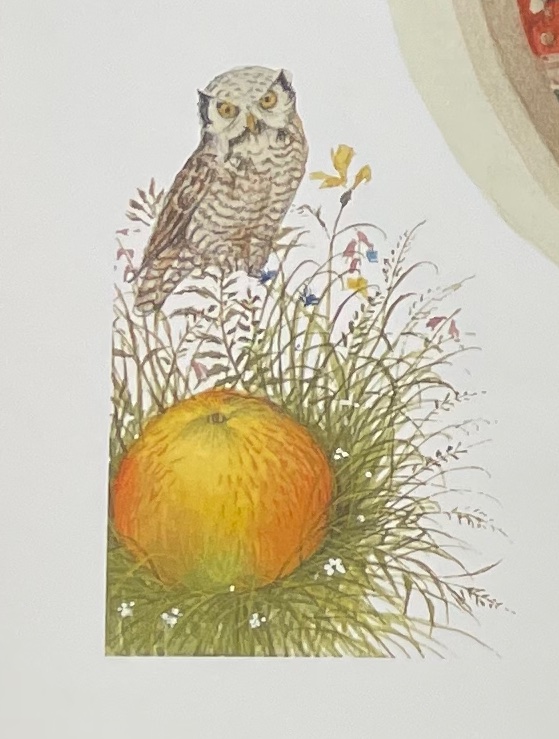 Look at how the back and front covers play with landscape perspective and the notion of the book as frame and canvas. The head of the spine interrupts the landscape to join the narrow orange frame that demarcates the edges of the landscape. All the same, the landscape’s hill of apples in the foreground overlaps the spine to descend into the landscape’s midground on the back cover, which deepens into a background of at least five levels like a medieval or Renaissance painting.