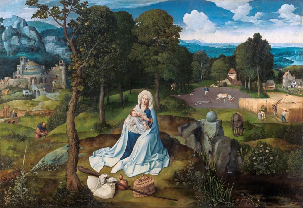 Another technique of perspective from those traditions is to place in the background things we know are large and in the foreground what we know is smaller. A temple or mansion behind, a mother and child or pie up front. These objects and figures often perform temporal double duty as in The Flight into Egypt, where the tiny workers misdirect the mass of Herod’s soldiers in the background while the Holy family looms large resting in the foreground. In Spirin’s illustration, the past apple-picking appears in the distance, and the resulting pie is near.