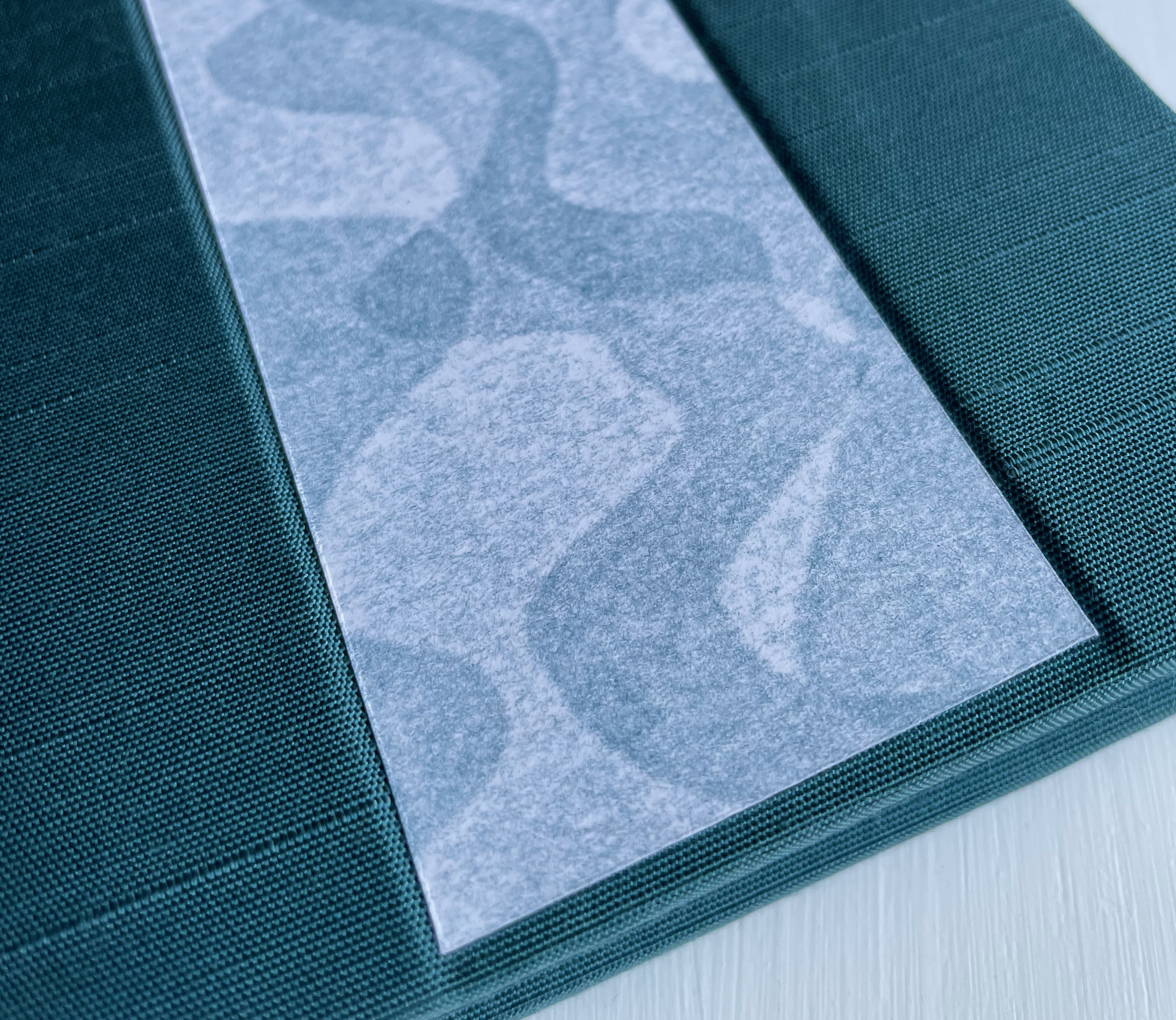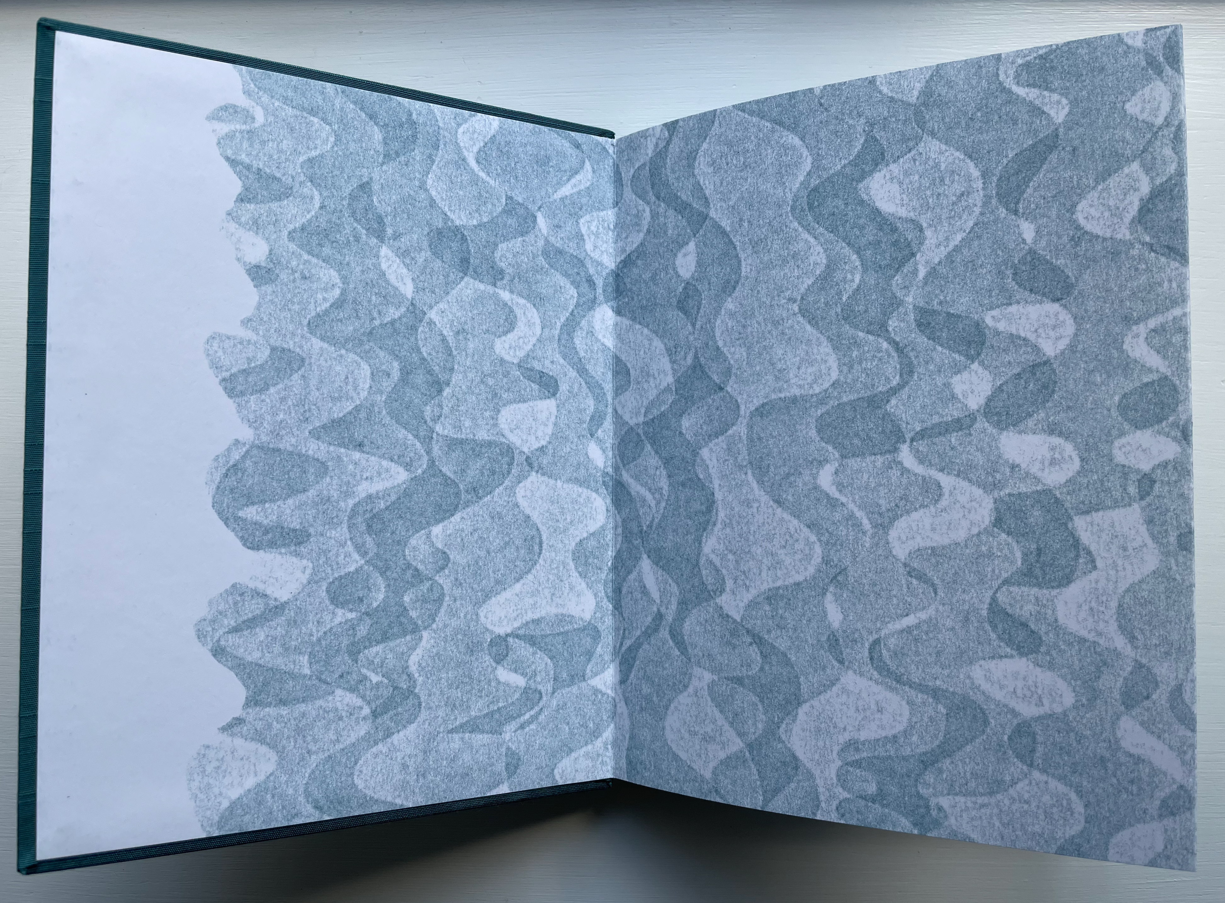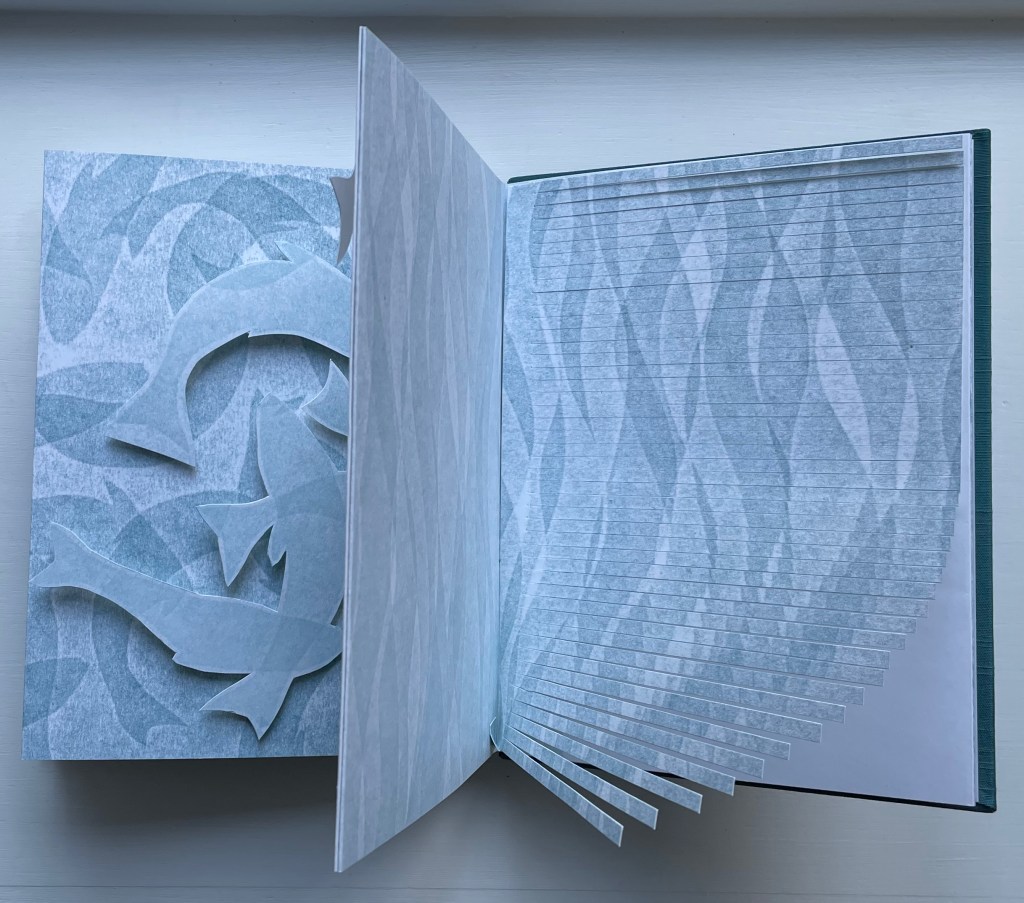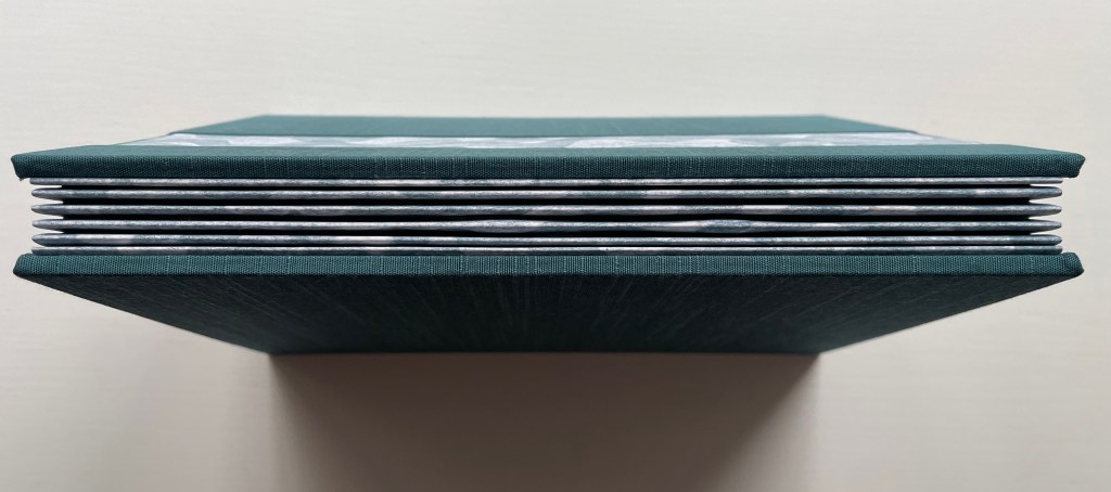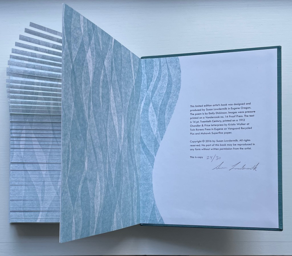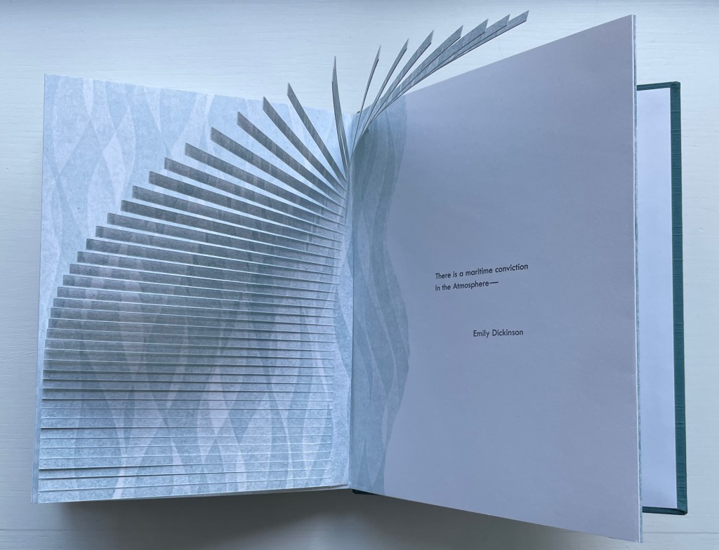 As she frequently does, Dickinson announces her core metaphor in the poem’s first line and goes on to develop and confirm or justify it in the lines that follow. As book artist, Lowdermilk has a slight advantage over the poet in being able to use the binding and printing to express herself even before the first line arrives. Before that first breath of air is taken, the Asahi book cloth’s color and the pressure print blue-gray pattern, which peeks from the exposed spine, is embedded on the front cover and flows over the doublure, evoke water, the sea and the maritime.