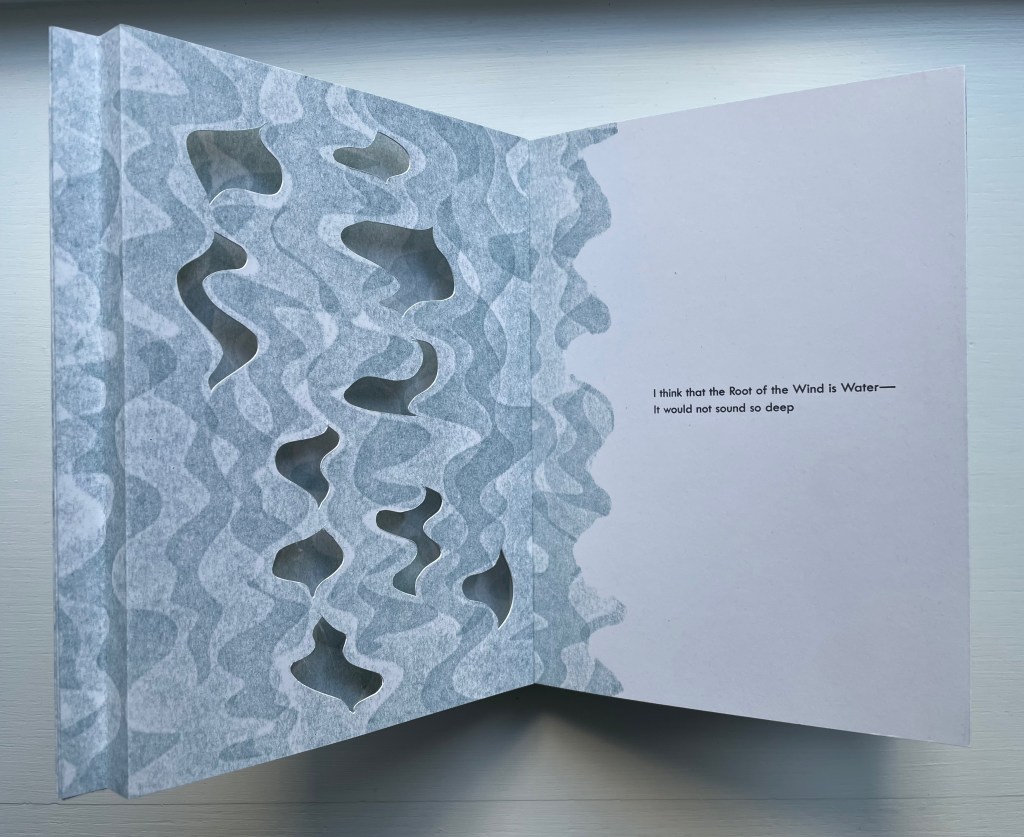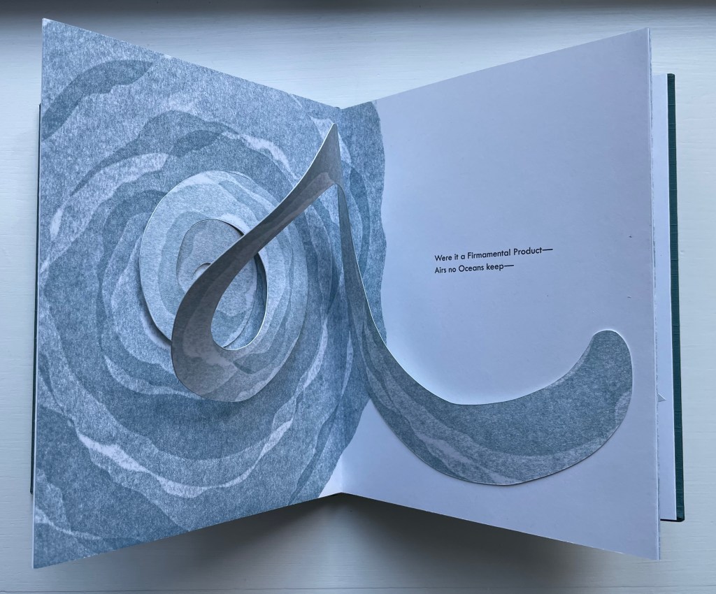 With the pop-up that follows, breathing the air above the page, Lowdermilk even manages to steal a march on the first half of the poet’s “Root of the Wind” metaphor. As the airy engineering is done with the paper printed with the watery pattern, enhanced by a reflective sheet of acetate beneath, it physically performs Dickinson’s entwining of wind and water. All that before and as the poem’s first two lines appear — and it just gets better with every turn of the page.