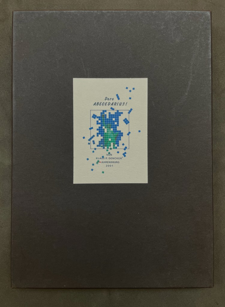 Although Dencker refers to 32 pages, there are 34. They consist of 1 cover, 1 English preface (typeset), 1 German preface (handwritten), 26 letter folios, 1 entitled Noch zwei fündstucke (“Two more findings”), 2 modified collages of R and Y, 1 entitled “Art sheet”, 1 colophon.
