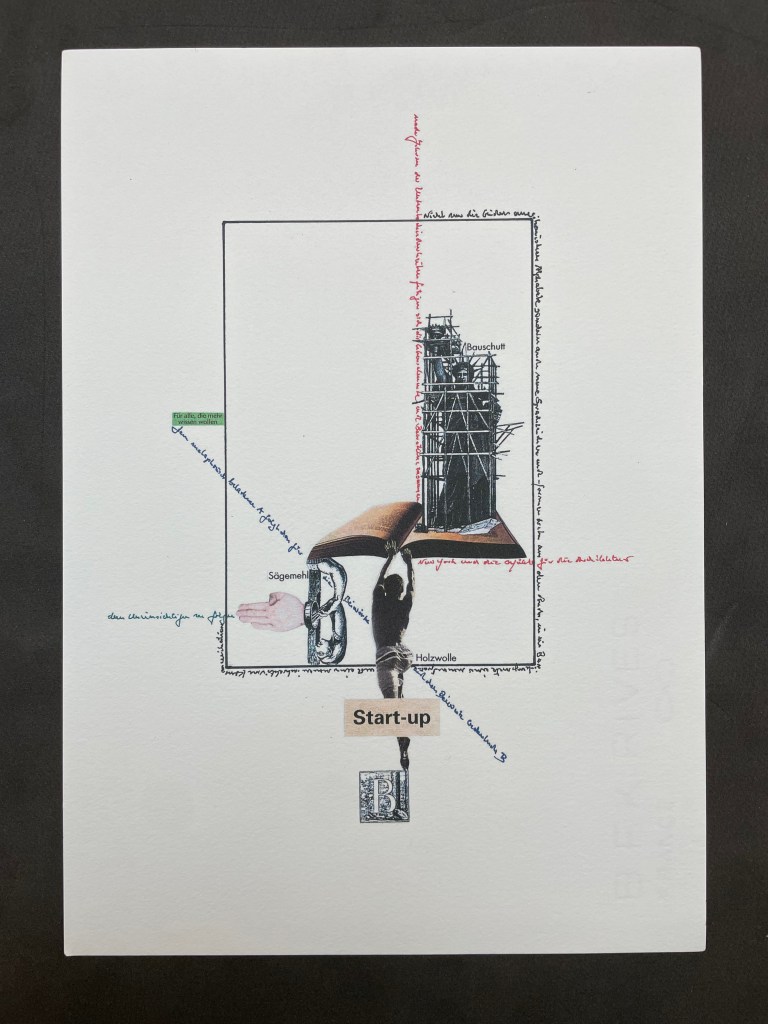 Within this work are personal experiences of many visits to the USA and the absurd idea, that a letter has its own meaning/importance. The ABC as an own sign-world and as an example for the dealing with seeming/apparent unliberties and so called rules. I work on the sequences usually by making first all collages on the pages, then the text-elements and finally a follow-up of a few corrections in the existing collages. The work should have had 28 pages and was done for an exhibition in the Buch- und Schriftmuseum Museum of the Deutsche Bibliothek Leipzig with the opening on the 8th of November 2001. On the 11th of September all collages on the pages were done and also some pages with text-elements. Looking back that particular day over my work I noticed some elements which I can`t explain: I saw some disturbing connections. So on pages F, M, O and Z. I added after the 11th of September some new elements only in the existing collages of page R and Y, and I added the last two pages after Z. So that now the work has 32 pages as a consequence of 11 September and was finished on the 21st of October 2001.