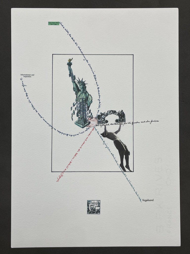 Artist’s statement: I started the work on “Dero Abecedarius” in the mid of July 2001. The work should have two principles of order: the sequence of the pages should follow the normal ABC, and the basic theme should be the Statue of Liberty which I am collecting since many years. This subject is a public-relation one in many variations, so that I could work on the idea of freedom especially with these partly absurd copies of our consumer society, to question it poetically and theoretically.