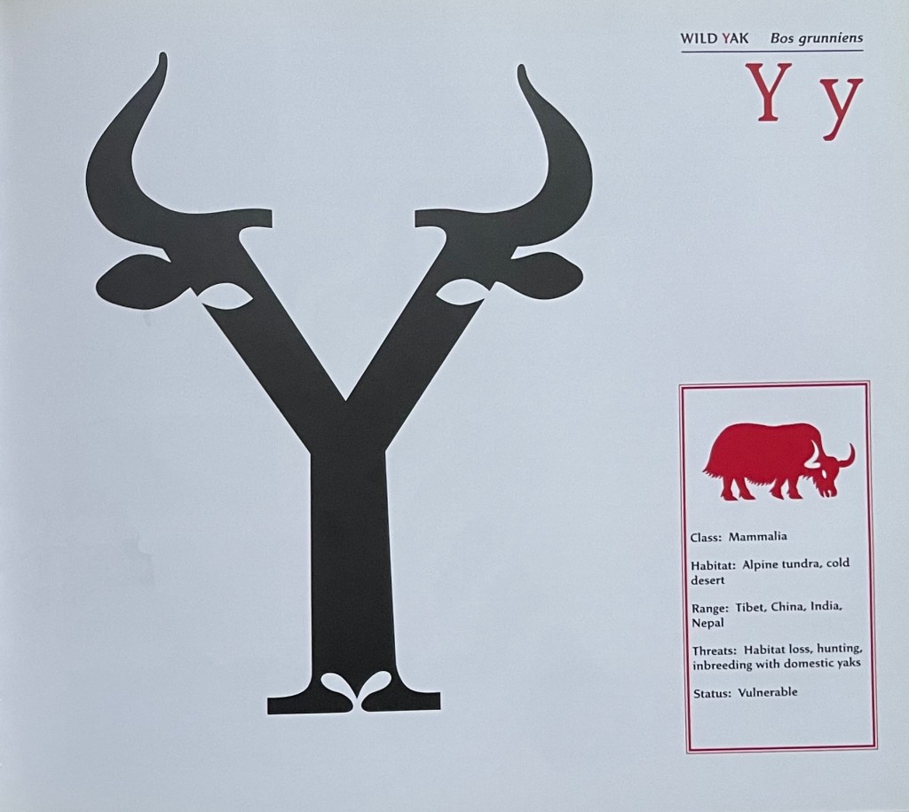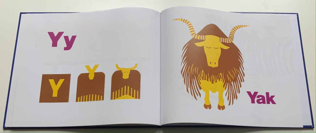 Consider again the “m” for metaphor and moo. Animals are the most frequent category of alphabet books in children’s literature, and so while there are dozens of them in the Books On Books Collection, it is the yaks in Suse MacDonald’s Alphabatics (1986) and David McLimans’ Gone Wild (2016) that ABCing conjures up.