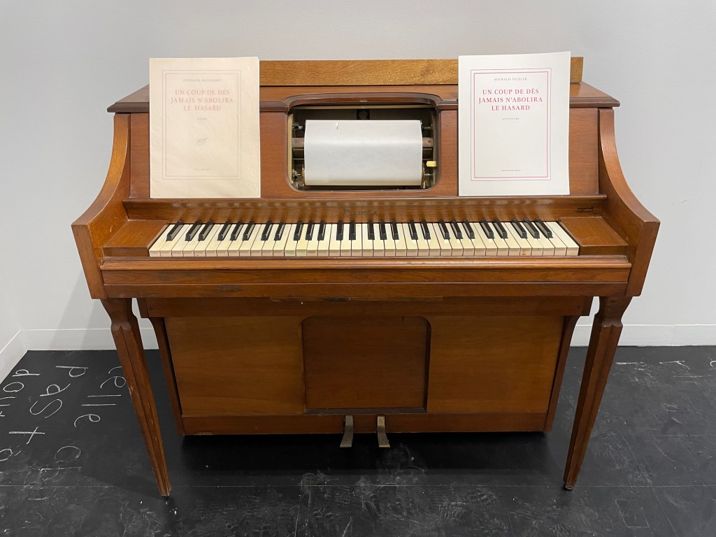 Pichler’s 2016 and 2024 exhibitions add another constituent practice to this project: that of performance art, but with the visitor as performer. Like a work of performance art, an exhibition has a venue and displays that serve as the stage setting. Performance art and exhibitions are both time-delimited, fixed within the period and hours of the venue’s availability. Where the length of a performance is constrained by the artist/performer’s stamina, this exhibition’s is constrained by the visitor’s stamina. Fortunately with Pichler’s performances, a less-than-indefatigable visitor has something other than a leaflet of performance notes as guide and souvenir: the volume COUP DE DÉS (COLLECTION): Books and Ideas after Mallarmé. This volume’s three essays and two book excerpts work together with the snapshots of the exhibition to put forward this premise that (COLLECTION) is intended as an artistic work in its own right.