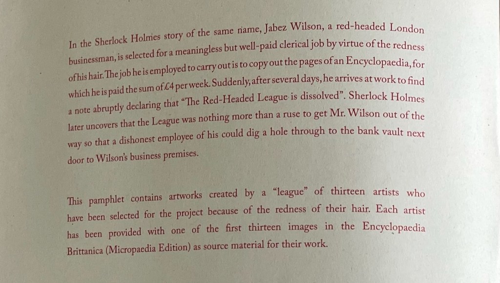 From the brief introduction to The Red Headed League, you might reach the intentions expressed in the extended curatorial statement here. It seems unlikely. In our age of appropriation art, you might spot a clue in Wilson’s assigned task of copying out encyclopedia pages. But only by knowing that each artist received a mere £4 for the assigned task of reworking one of the first thirteen images under the A’s in Encyclopedia Brittanica’s Micropædia would you recognize that there’s more afoot. And perhaps only a Sherlock Holmes would spot the selection criterion of red-headedness as a clue to the intention to call out art show curators’ “selecting artists based on nonartistic criteria”.