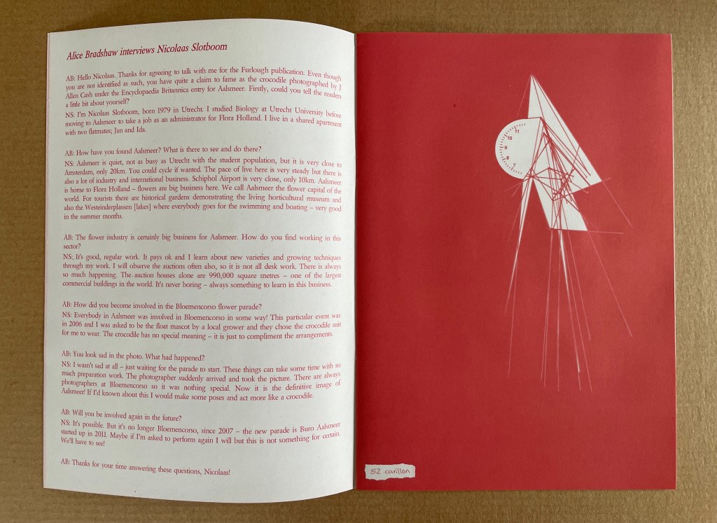 The task clearly tickled some artists’ funnybones. Alice Bradshaw demonstrates the lengths to which an artist will sometimes go. Confronted with her source material — a photo of the annual flower festival in Aalsmeer — she tracks down Nicolaas Slotboom who appears in a green crocodile costume while sitting on a float waiting for the parade to start. What Holmesian detective work. And what a surprise, all text and no images. Perhaps it reflects that ongoing rivalry between text and image in the artist’s book tradition as art writ (or painted) large. Surely the curators and Bradshaw must have known that readers would be so intrigued by the description that they would engage in their own detective work to see Nicolaas sitting in his costume on the float.