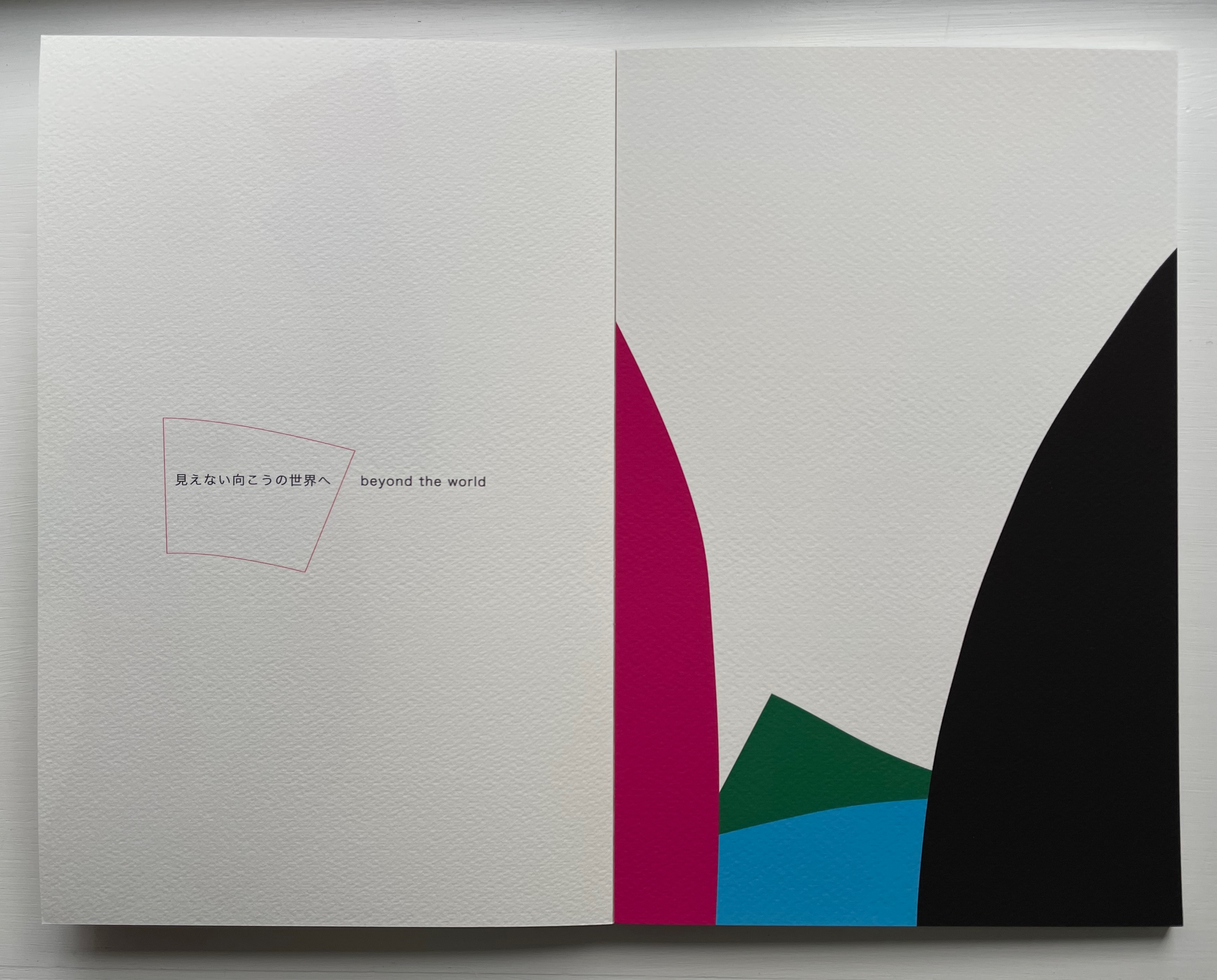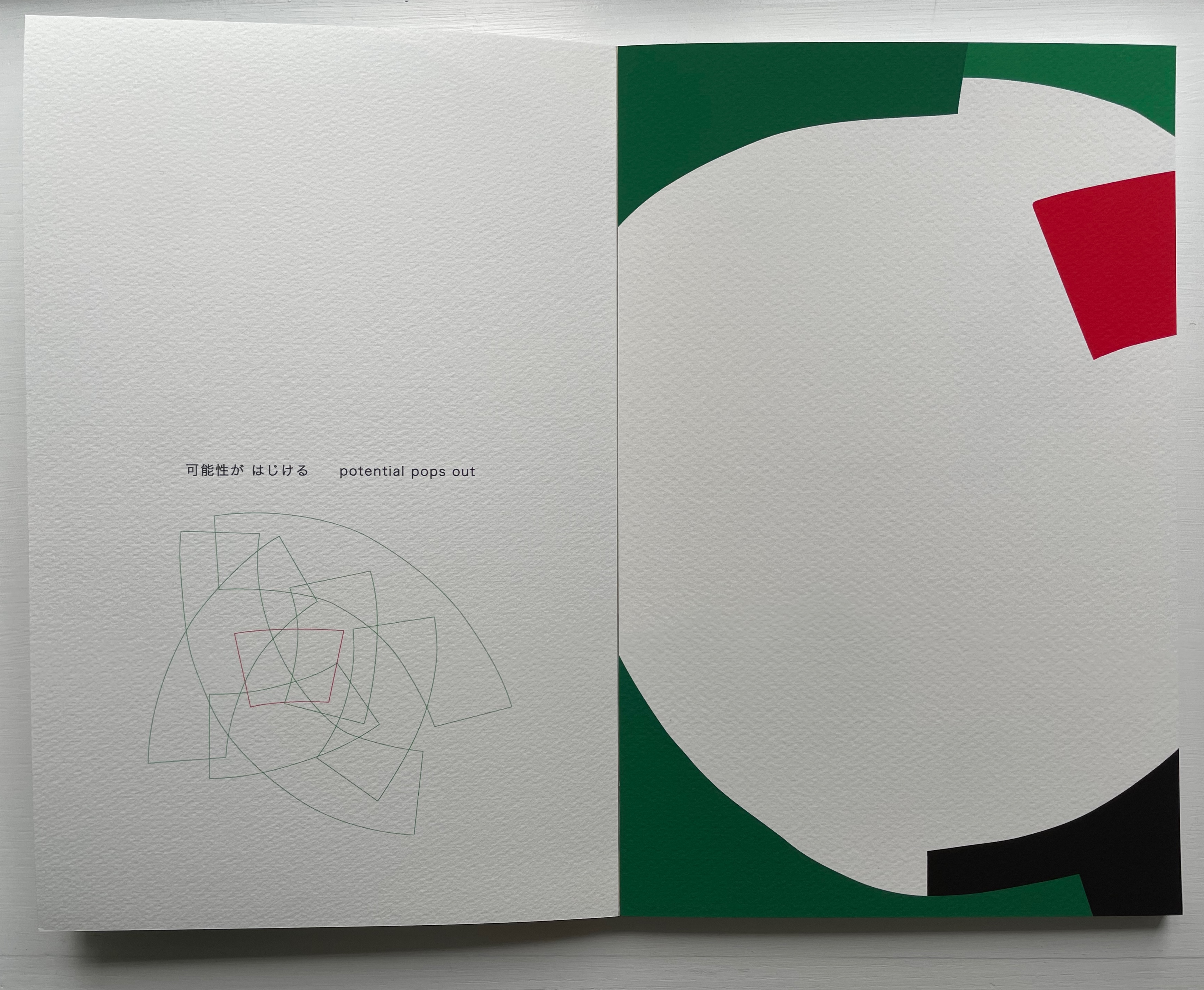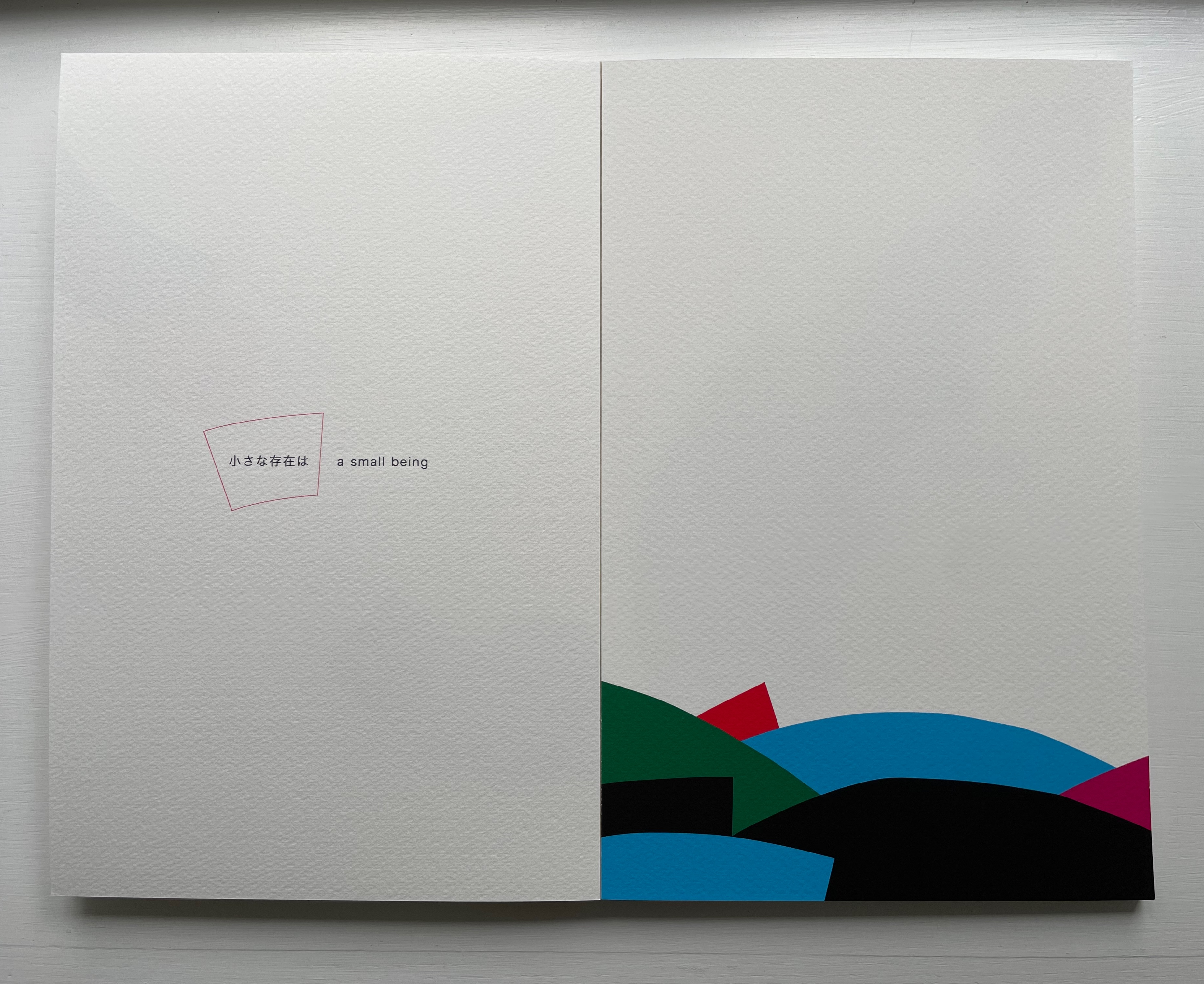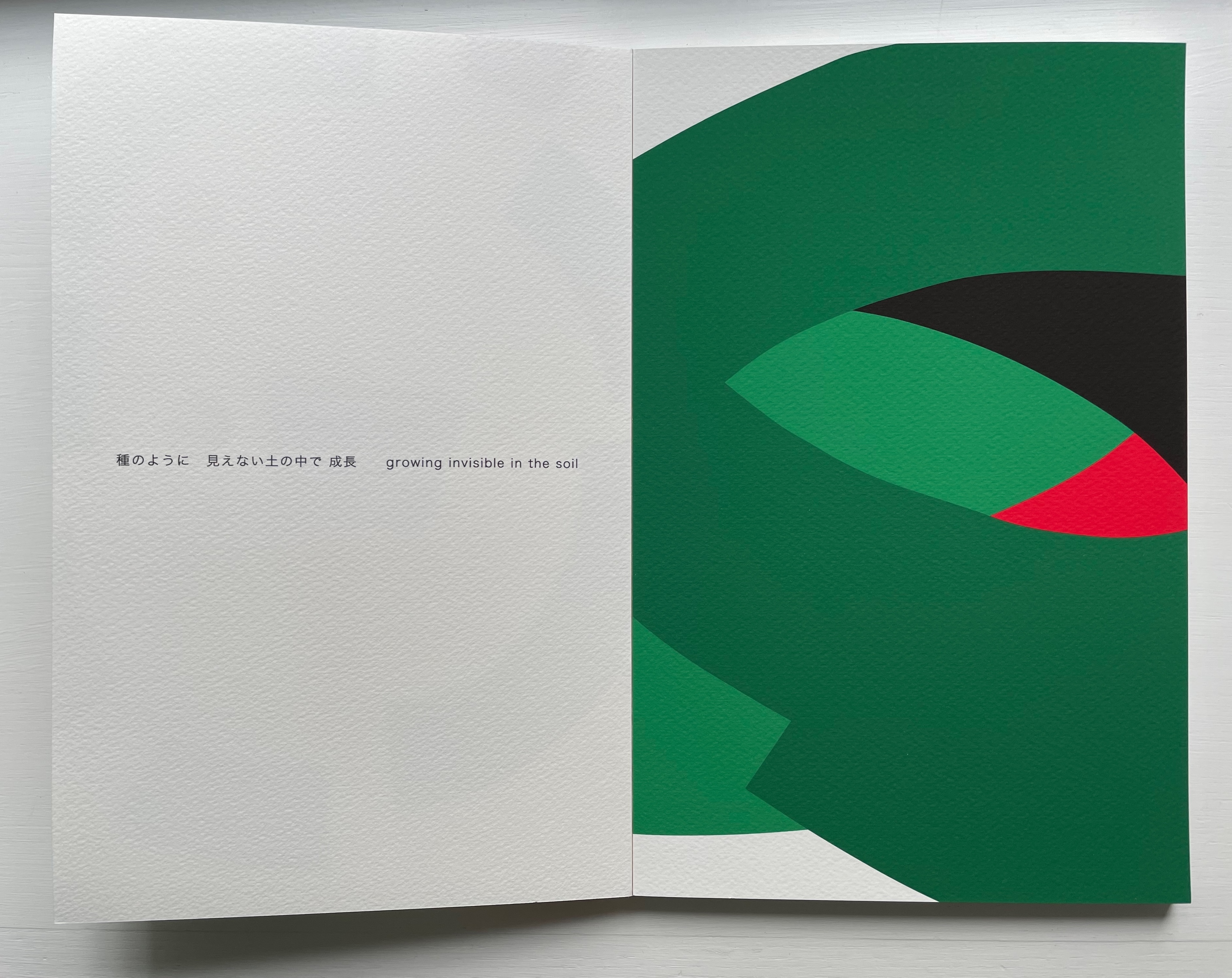 In the first double-page spread, a lone line of Japanese and English introduces the idea of the seed, while a not quite invisible red shape lies buried in the soil of the collage on the right. In Japan, red is associated with vital forces. As the page turns to the next spread, a schematic appears beneath another line of Japanese and English. Its multi-colored outlined shapes provide the clue that we have zoomed out and are looking at a schematic of the collage from the preceding spread. On the facing page of the second spread, though, the pieces of collage shift, the red seed piece turning its curve downwards and moving up the page with the green and black pieces spreading to the margins and revealing a space of white.