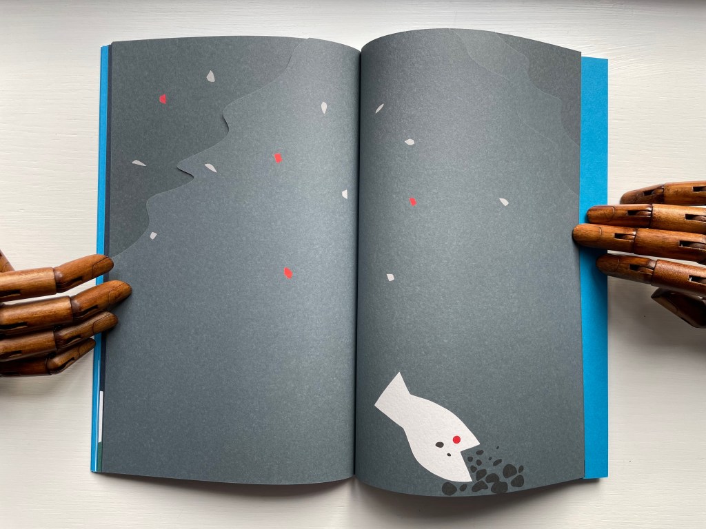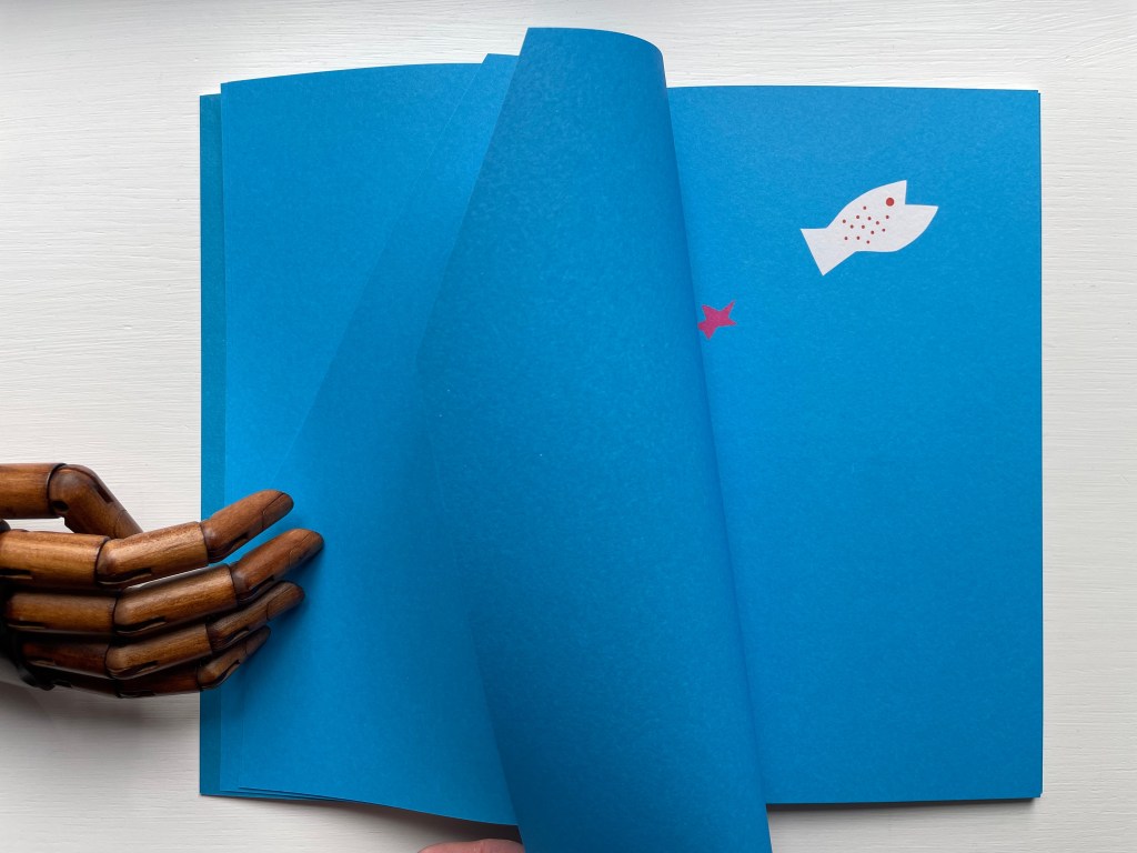 Another wordless picture, but this time the driving forces are the narrative of a fish who will eat anything and pages whose shape change to reflect the story. The story of this perch was prompted by Komagata’s observation of his daughter who, like most toddlers, tended to put anything within reach in her mouth. In one end and out the other is the narrative pattern as the sequence of pages below shows.