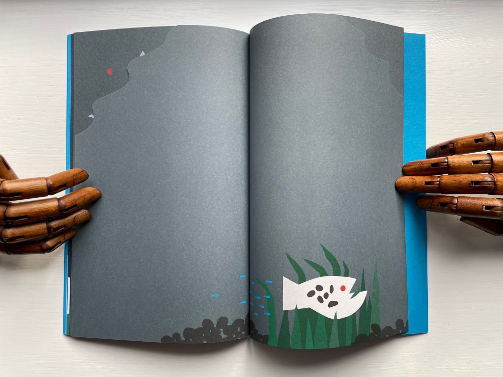 Pacu Pacu does get into trouble with swallowing a particularly oversized stone, but a munch of vegetation clears the problem and teaches the perch a trick with which to weather the turbulence in the next sequence signaled by the change of background color, bending weeds and the wavy shaping of one corner of the pages.
