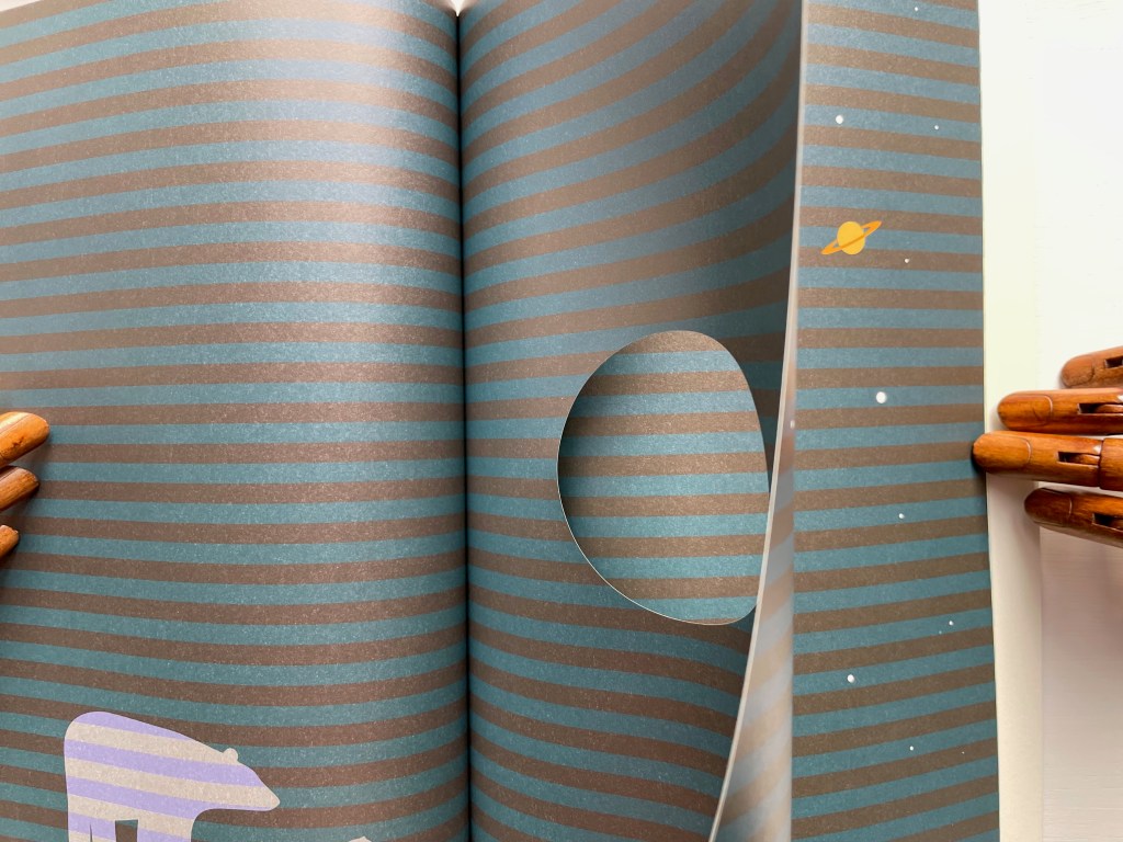 Most wordless picture books rely on changes in images to drive the reader from start to finish. Komagata, however, has also used the phases of the moon, an “around the world” theme, and dynamic cutouts to provide the forward thrust for this book. As the pages turn, the moon becomes an object. As the phases of the moon change its shape, so accordingly the object’s shape changes. As these changes take place, we move across settings from different parts of the world: from a cityscape under a full moon, then overseas to a jungle under a partial moon, later from an arctic setting under a new (empty) moon to a perspective in outerspace, and finally back to a cityscape. The book’s colophon includes a teasing color chart with the heading “Find the Same Color”, but no two are quite the same shade.