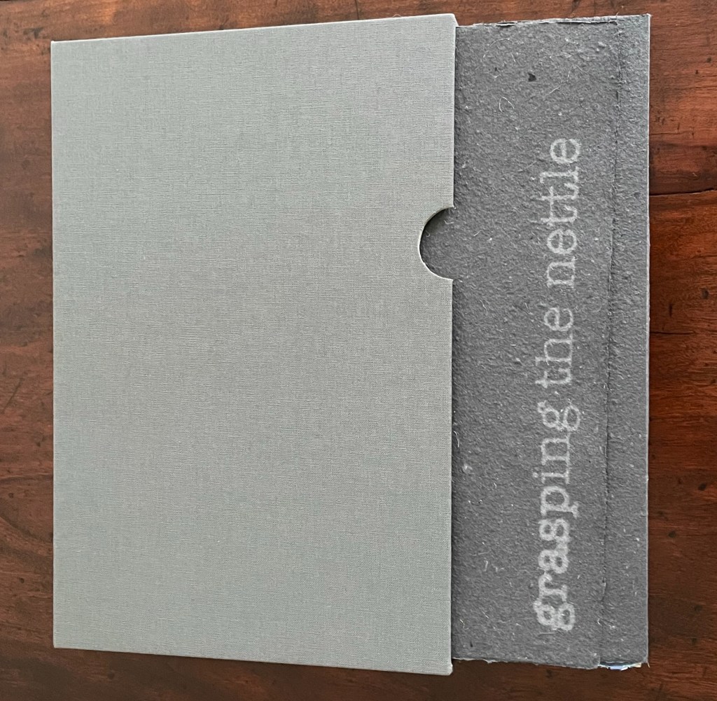 Along with the overlapping manipulation of papermaking and cast printing, Grasping the Nettle manipulates “the medium of the book”. Instead of a codex’s front cover to bear the work’s title, the overlapping wrapper with a slant cut performs that role before sliding into the protective slipcase. The accordion, loose alongside the three booklets, performs the role of colophon. Information that would otherwise appear in the colophon at the end of a book — the number of the copy, count of the edition, etc. — appears faintly on the cover side of the accordion. By offering a display backdrop to the three booklets, the accordion also performs in form and image its role of colophon: the final stroke for the three booklets whose imagery and text make up the core of Grasping the Nettle.