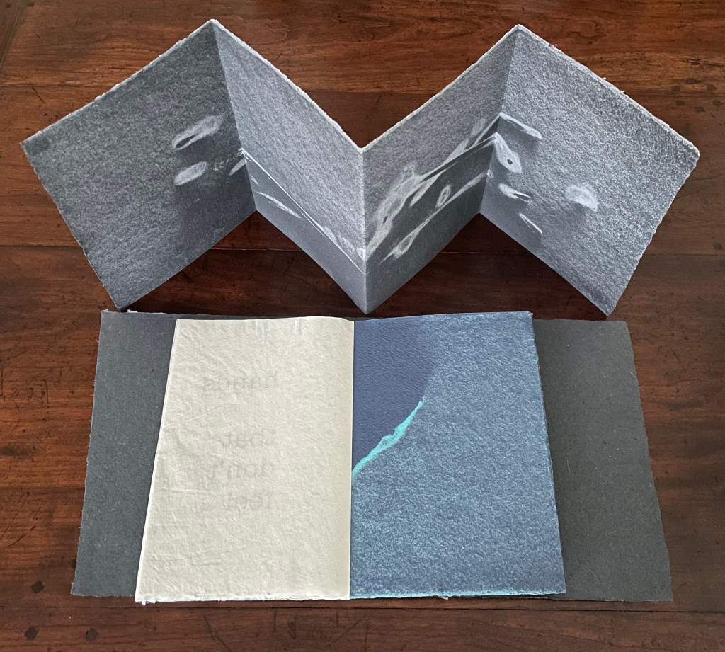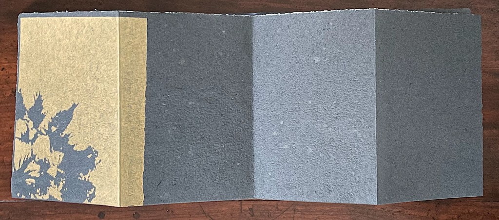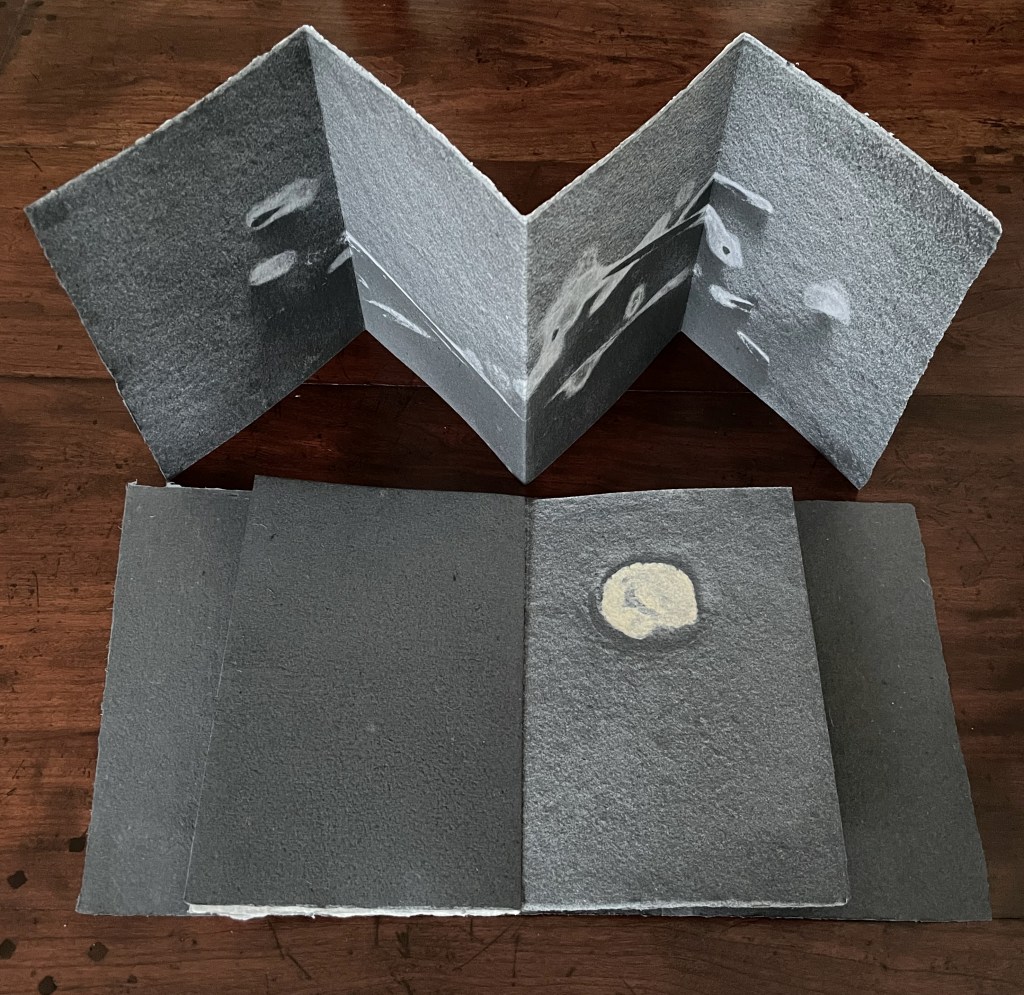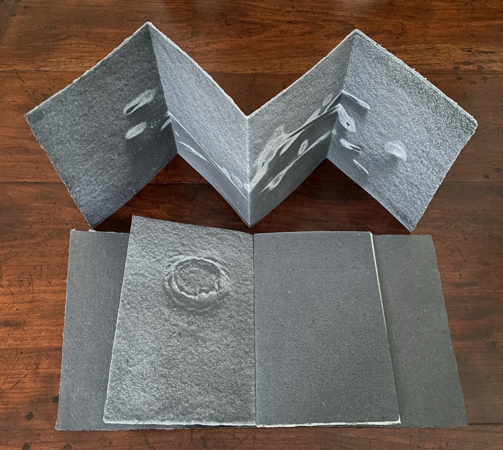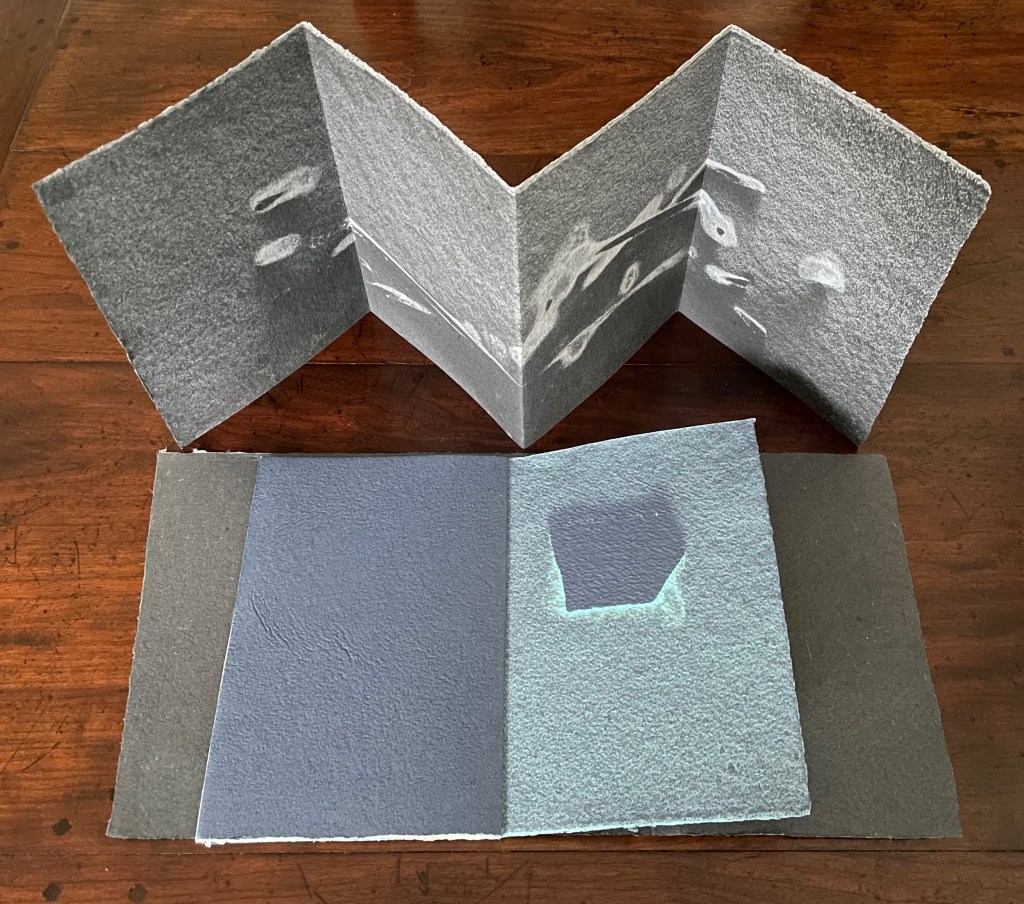 The blue booklet or signature: a flat stone laid atop couched paper and sprayed with fine pulp generates the images embracing the kozo pages pulp printed with text.