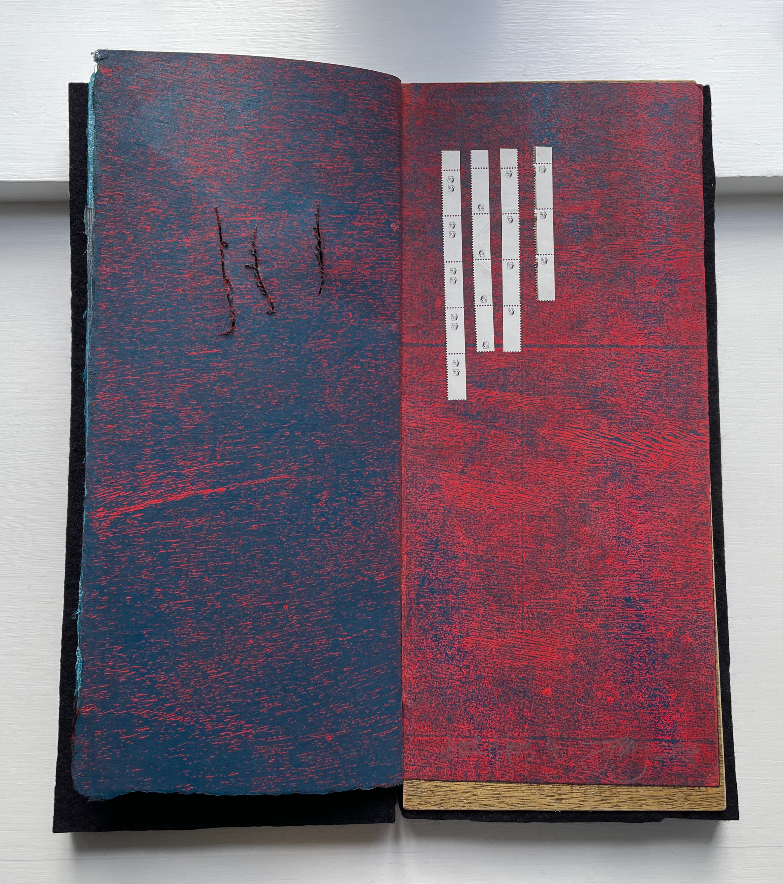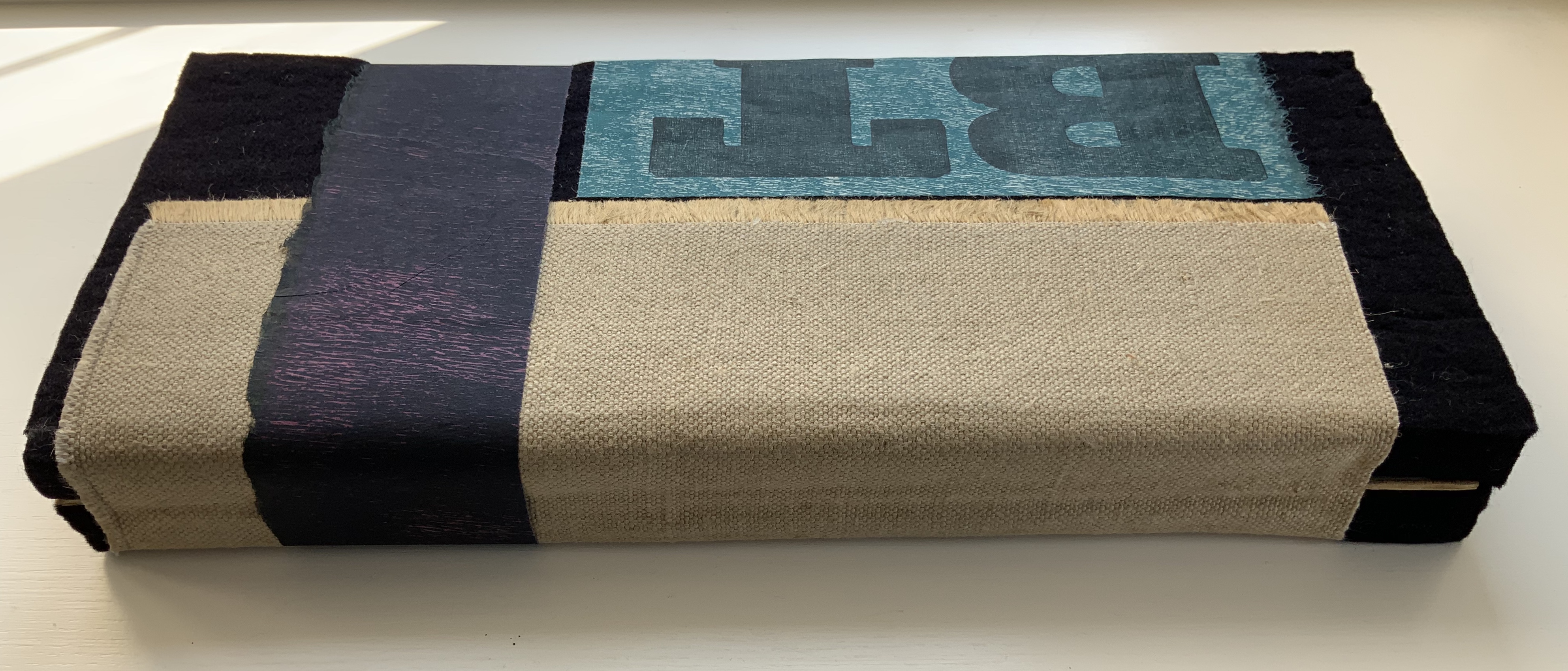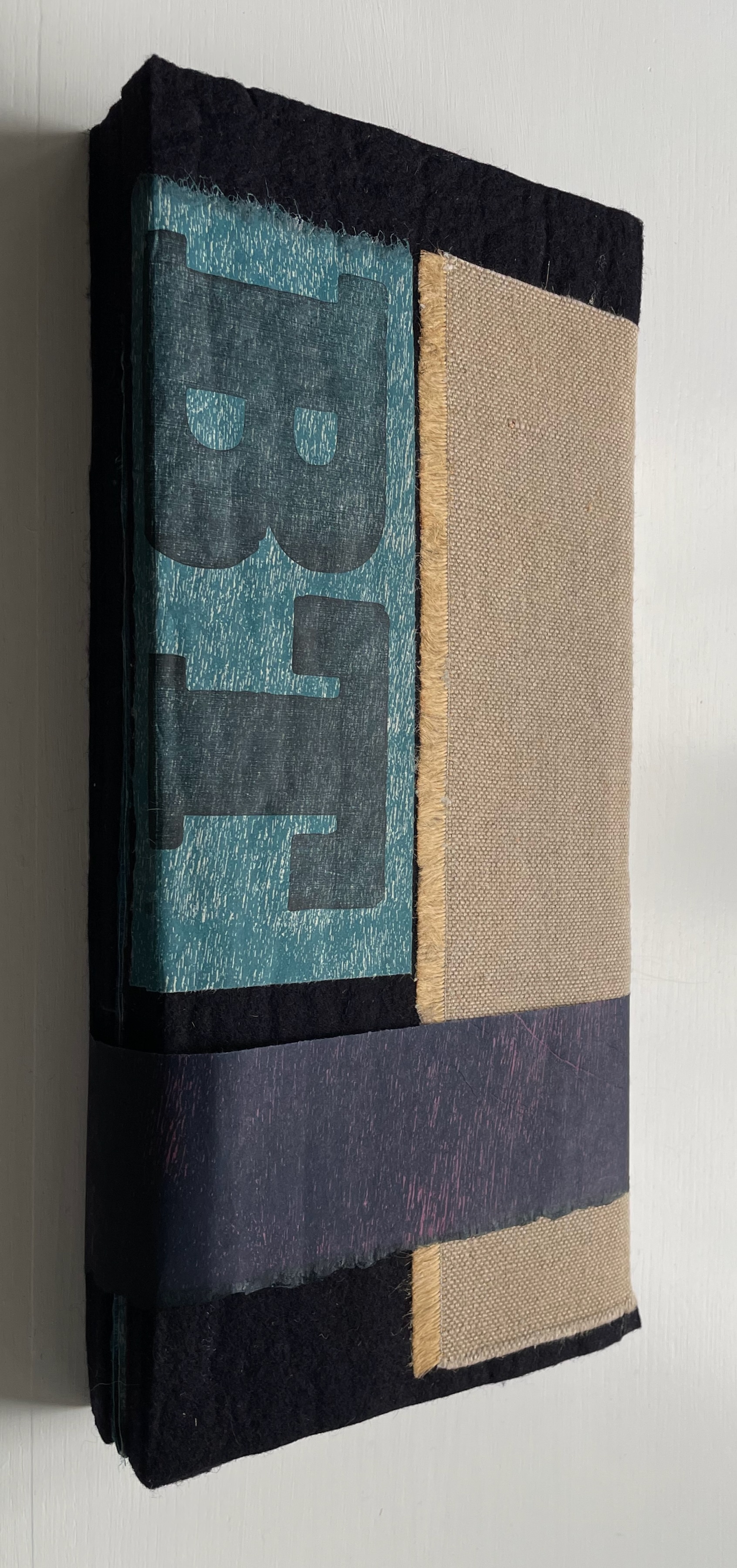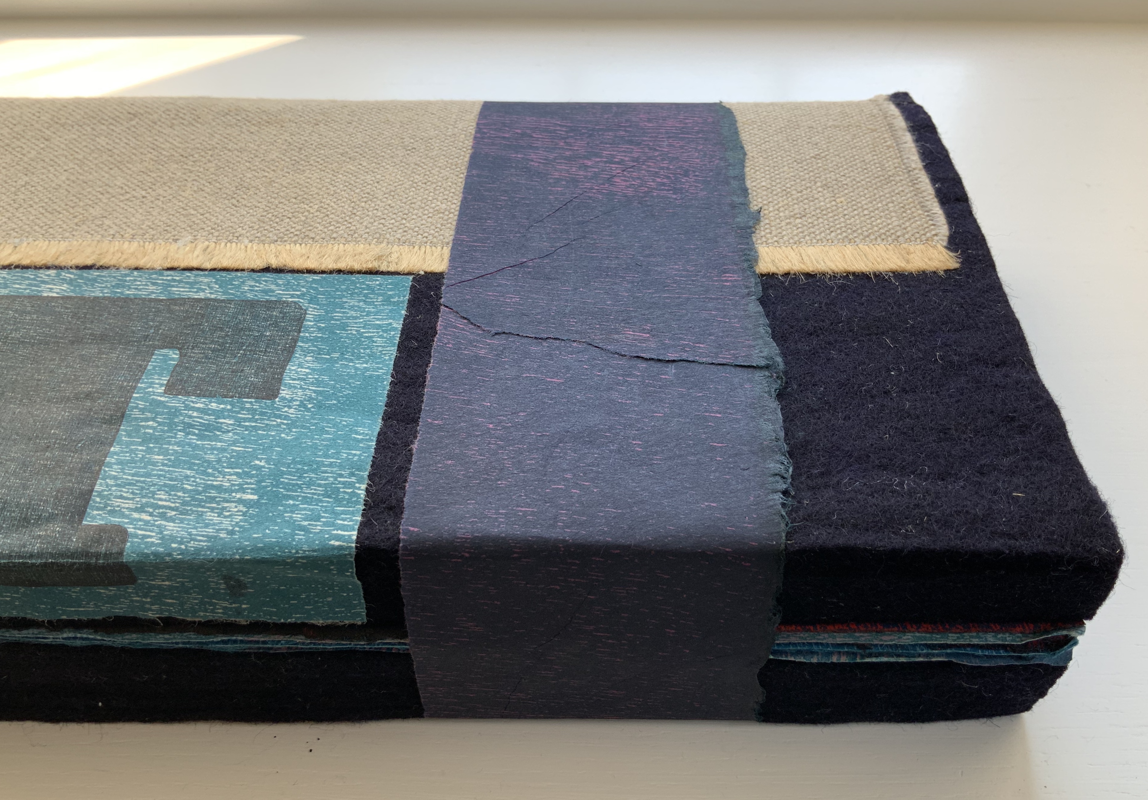 Single segment casebound codex, relief prints (rainforest plywood and linocuts) on Awagami Kozo, rainforest plywood, felt front and back boards. H390 x W170 x D45 mm. Variable pages. Edition of 4, of which this is #4. Acquired from the artist, 15 September 2020.