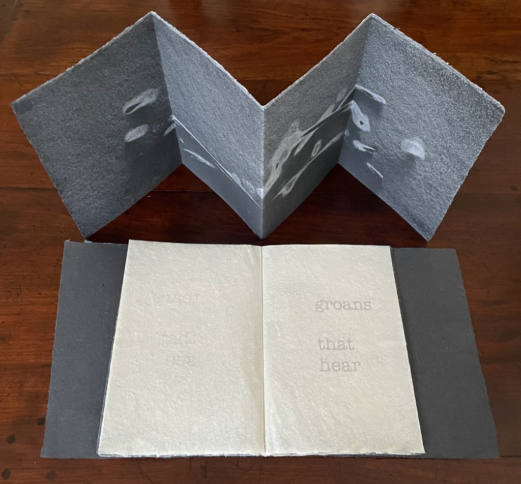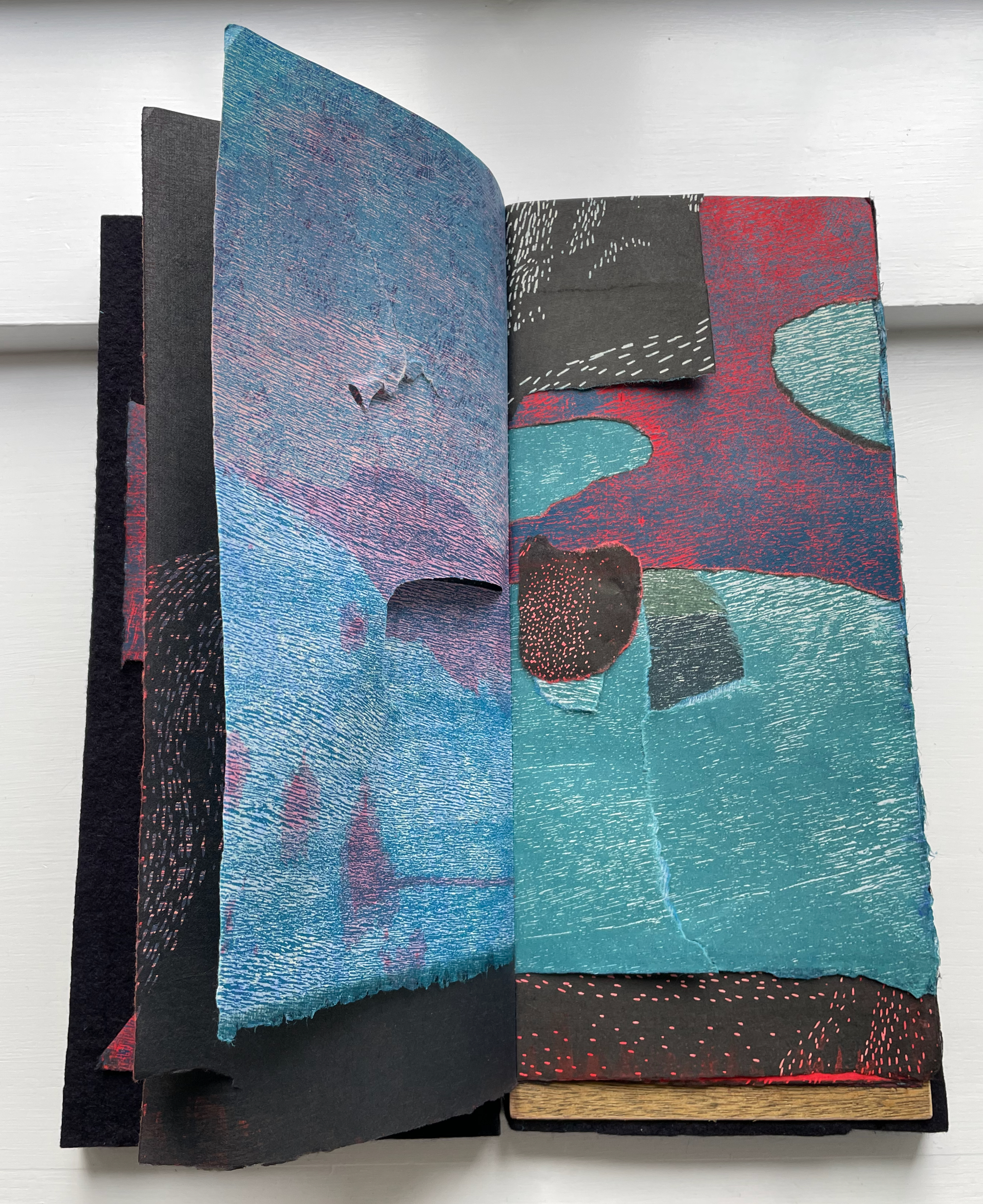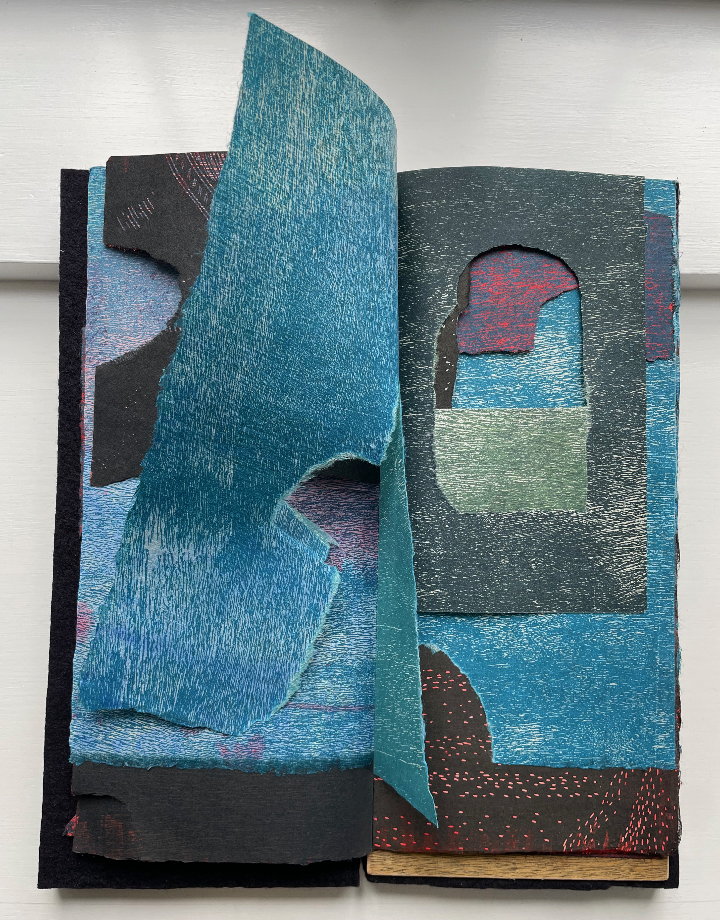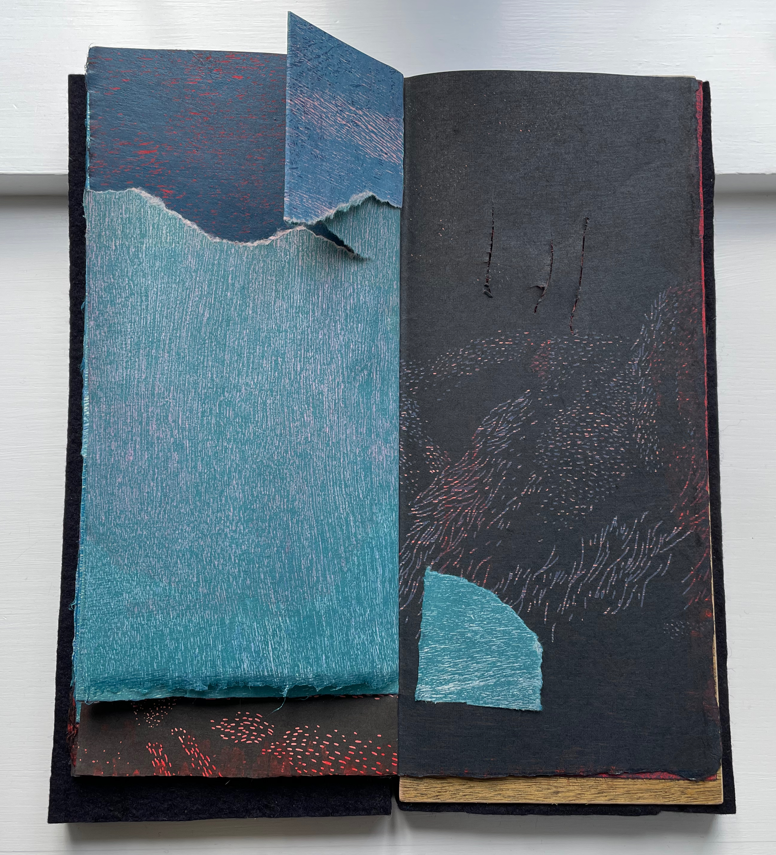 Single segment casebound codex, relief prints (rainforest plywood and linocuts) on Awagami Kozo, rainforest plywood, felt front and back boards. H390 x W170 x D45 mm. Variable pages. Edition of 4, of which this is #4. Acquired from the artist, 15 September 2020.