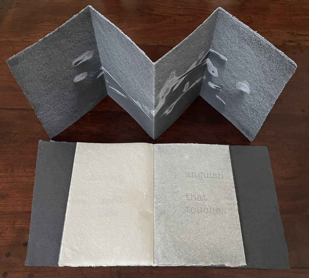 That phrase “representation by touch” is too easily skated over. It requires unpacking. Start with three facts: first, what appears to be concave or convex in the surface of some pages is only an appearance, the surface is flat though rough; second, the rough texture of the surface is down to the handmade nature of the papermaking and pulp printing technique applied to it; and third, the images in the four parts of Grasping the Nettle bear no visual or pictorial resemblance to the objects that gave rise to them. For example, the image in the accordion comes from eight twigs resting on couched paper before being sprayed with fine pulp and then later pressed. It is the touch of water, paper and colored pulp against one another that compresses, enfolds, unfolds, and expresses an embodied abstraction. Mosely calls it a “cast imprint”.