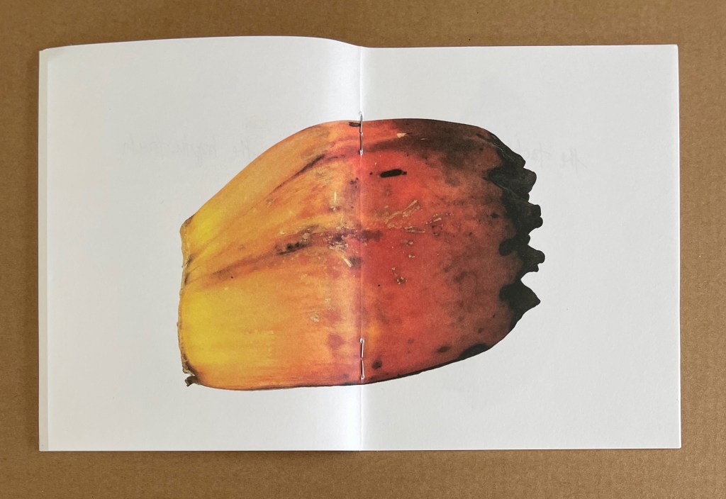 As in Grasping the Nettle, Mosely plays with the structure of the codex, but he does so differently. In Directed Smooth Space, he first places text and image each on a recto page facing blank verso pages (see above). Then at the center of the book, a large horizontal image of the breadfruit seed occupies the double-page spread. After that, the text and image each shift to the verso page faced by blank recto pages (see below).