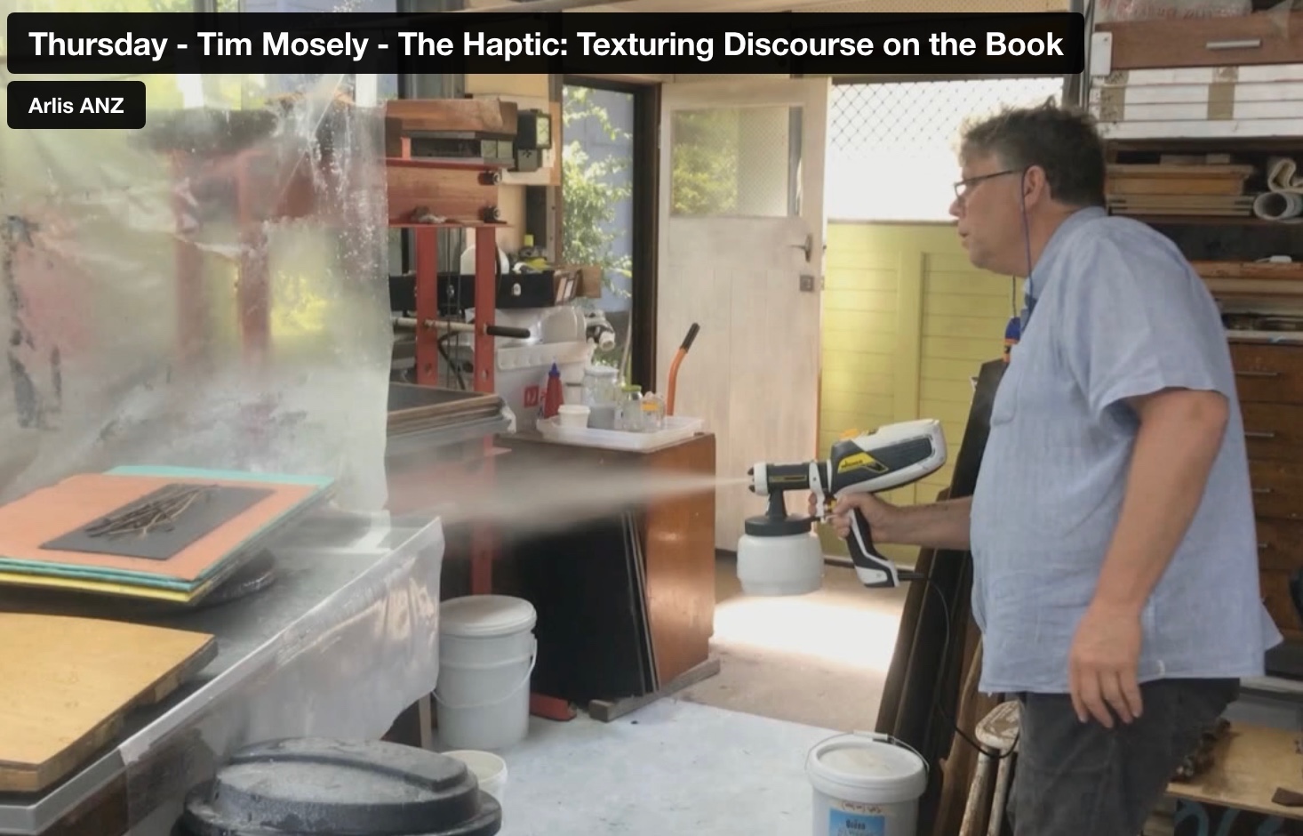 From the 11’37” mark. Tim Mosely, “The Haptic: Texturing Discourse on the Book“. Reimagining the material: artists books, printed matter, digital transformation, engagement. ARLIS-NZ Biennial Conference, 11-13 November 2020, Brisbane.