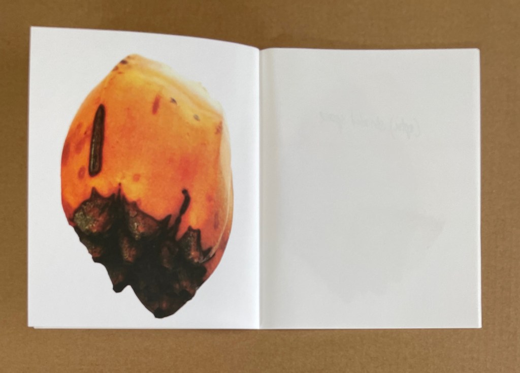 Eyes closed and lying down on the floor of the boat, these nomadic sailors could feel what oceanographers have documented — the pattern of undulations caused within the ocean currents by distant bodies of land. How ambitious that a small booklet produced by offset printing, juxtaposing double-page swells of almost touchable images of breadfruit seeds with double-page swells of handwritten cryptic philosophical phrases, should invoke this most haptic means of perceiving where we are.