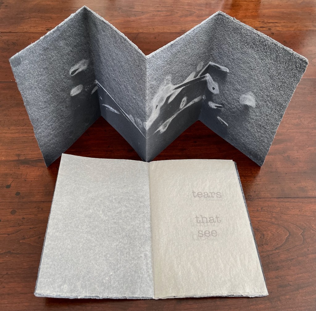 Even as an edition, The Book of Tears is ambiguous. It consists of four copies — one held at Carleton College Library in Artists Books Collection, a second in the Susan Filter & Peter Koch Collection of the Art of the Book, a third in a private collection, and the fourth in the Books On Books Collection –but each of the four is unique due to the handmade materials and process of composition. Even that uniqueness is ambiguous because each relies on its readers’ participation in what Mosely describes as the book’s “resolution”.