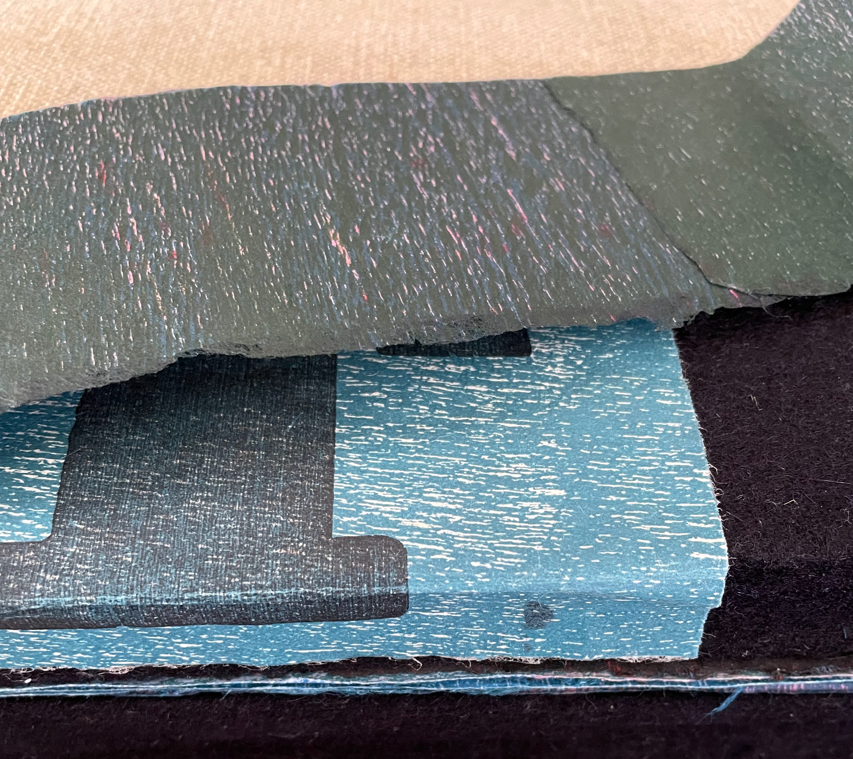 Even the painterly and sculptural qualities of The Book of Tears offer ambiguity and multivalences. The burlap hinge securing the front and back covers hints at the painter’s canvas. The covers’ bulk belies their lightness and sponginess, while their deep blackness plays a dark Caravaggesque background against which the book’s pages will play. The plywood is rainforest plywood. The book block, usually the thickest part of a book, is the thinnest, like a sheet of wet paper being squeezed between the two blocks of felt. The pages themselves vary in weight, texture, color and size. The prints derive from multiple relief techniques, oil and water based inks. Peering into this book, the reader is pulled into all these tensions — oil and water, size and apparent weight, thickness and thinness, artifice and nature, light and shadow, complete and incomplete, and the haptic and the optical. How are the tensions to be read? Can they be resolved?