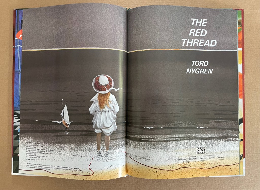 The Swedish expression “den röda tråden” translates best as “the common thread”, the thing that links together otherwise disparate things and experiences. The literal translation, however, works best for Tord Nygren’s Den Röda Tråden (1987), leaving us to follow the red thread that the clown offers to the children on the front cover. The thread wraps around to the pastedown and across the fly leaf chased by the runaway carousel horse …
