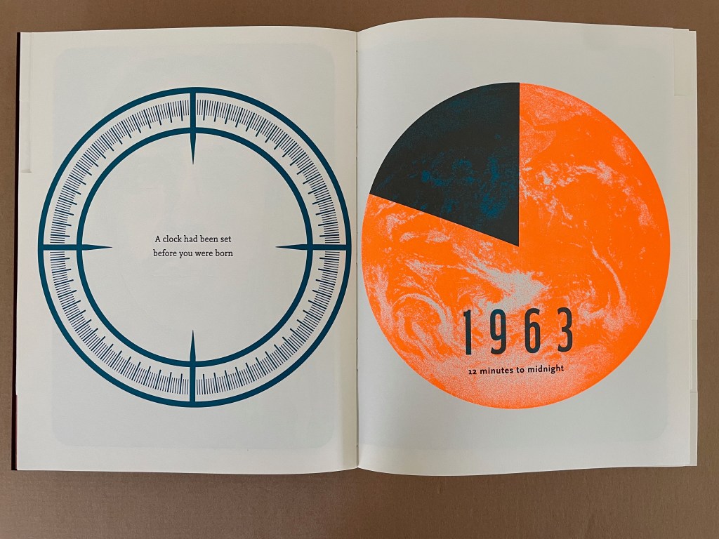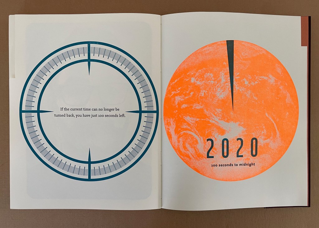 The second sequence on both the AM and PM sides introduces different but parallel topics. Unlike the first sequence, which doubles the number of images by revolving on the horizontal axis, the second sequence is actually two sets of images. The spreads on the AM side display a bomb site on the left and a graphic from the Doomsday Clock on the right. The spreads on the PM side show statistics and a graphic from the COVID-19 pandemic.