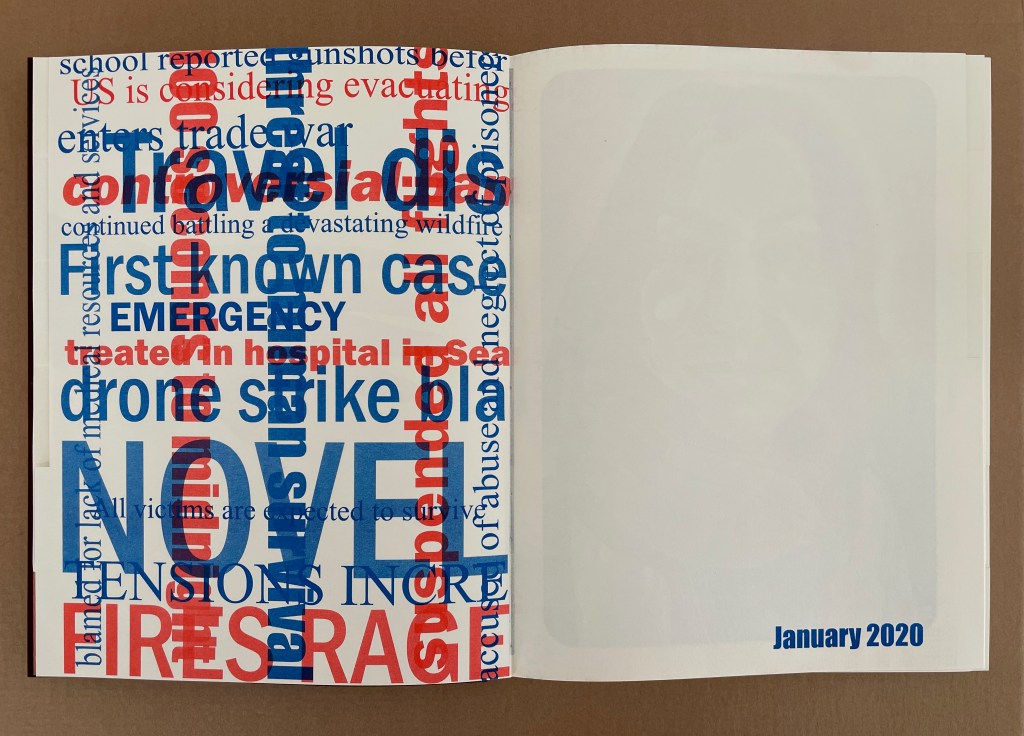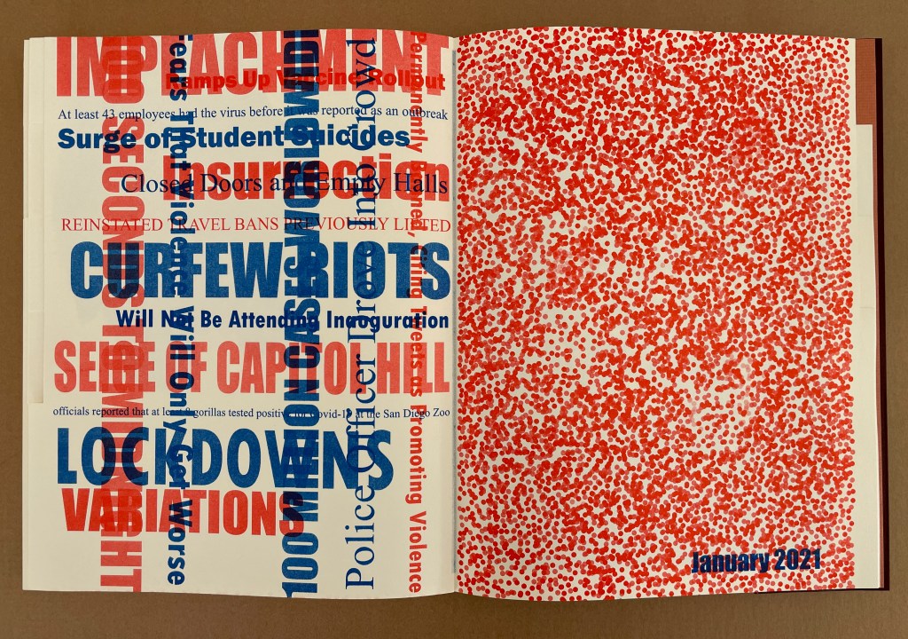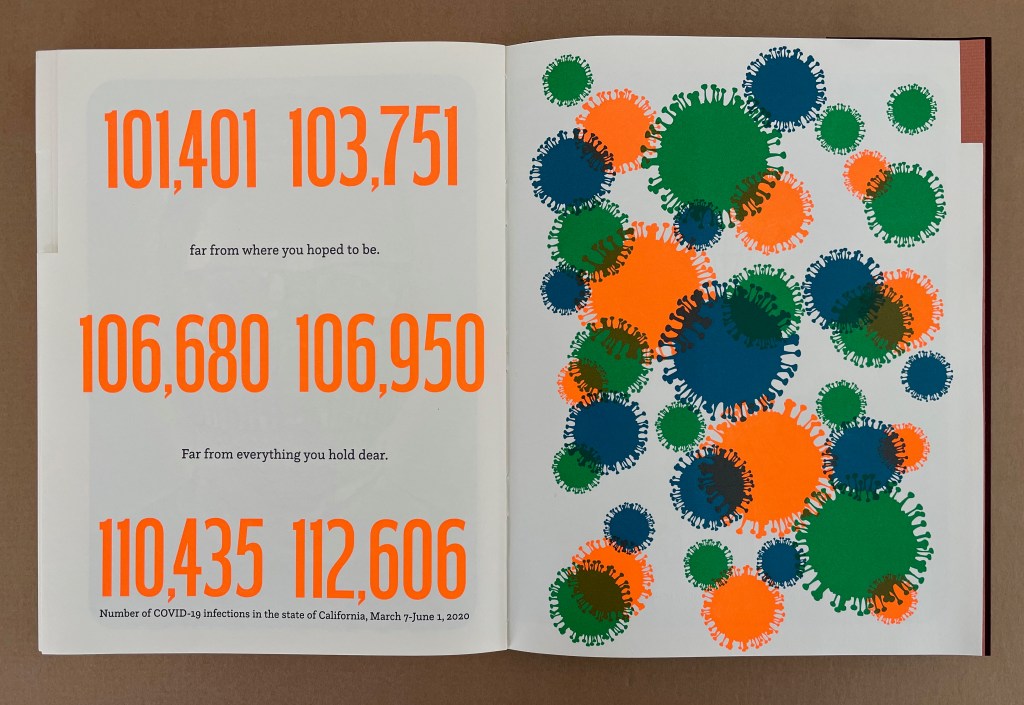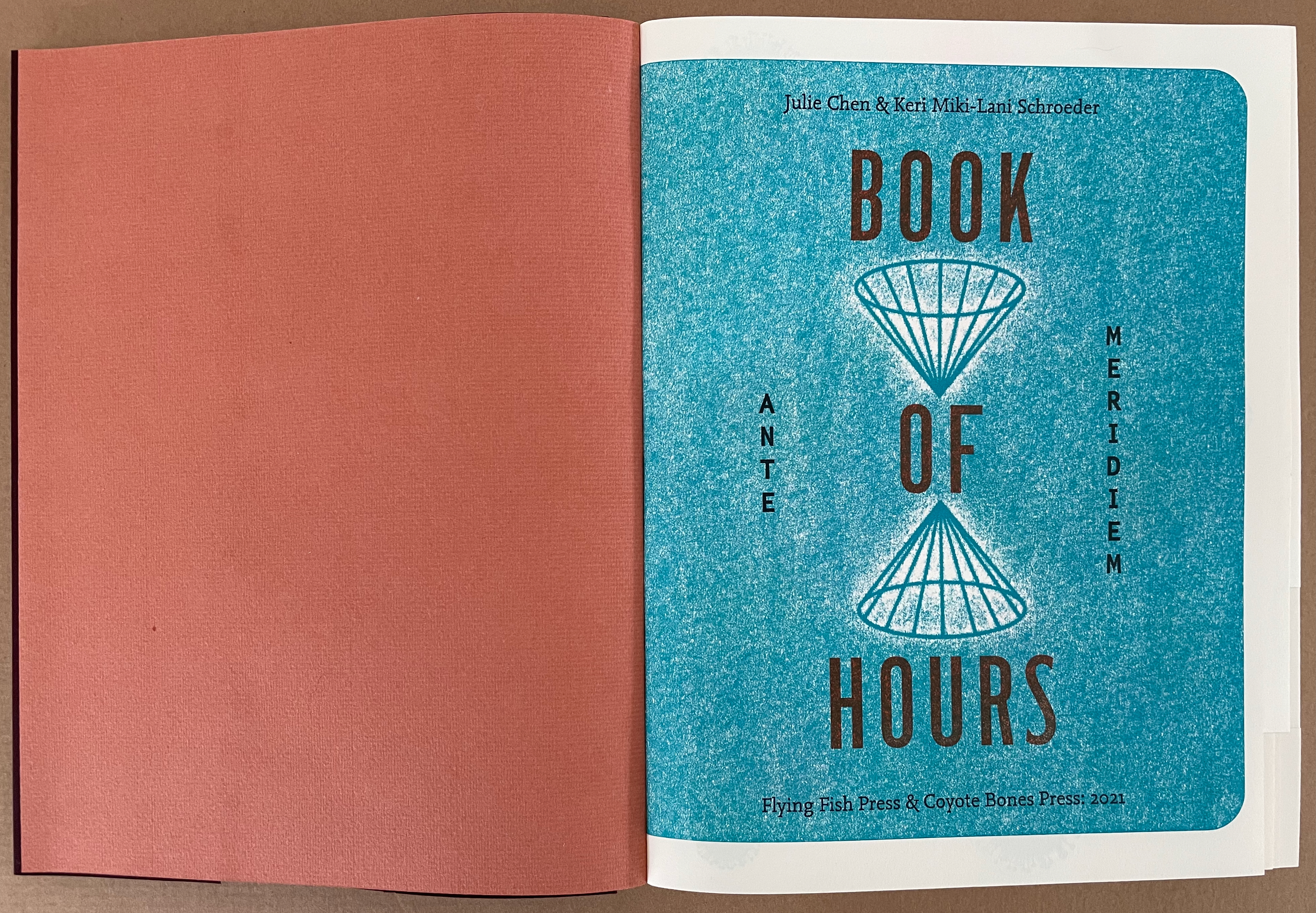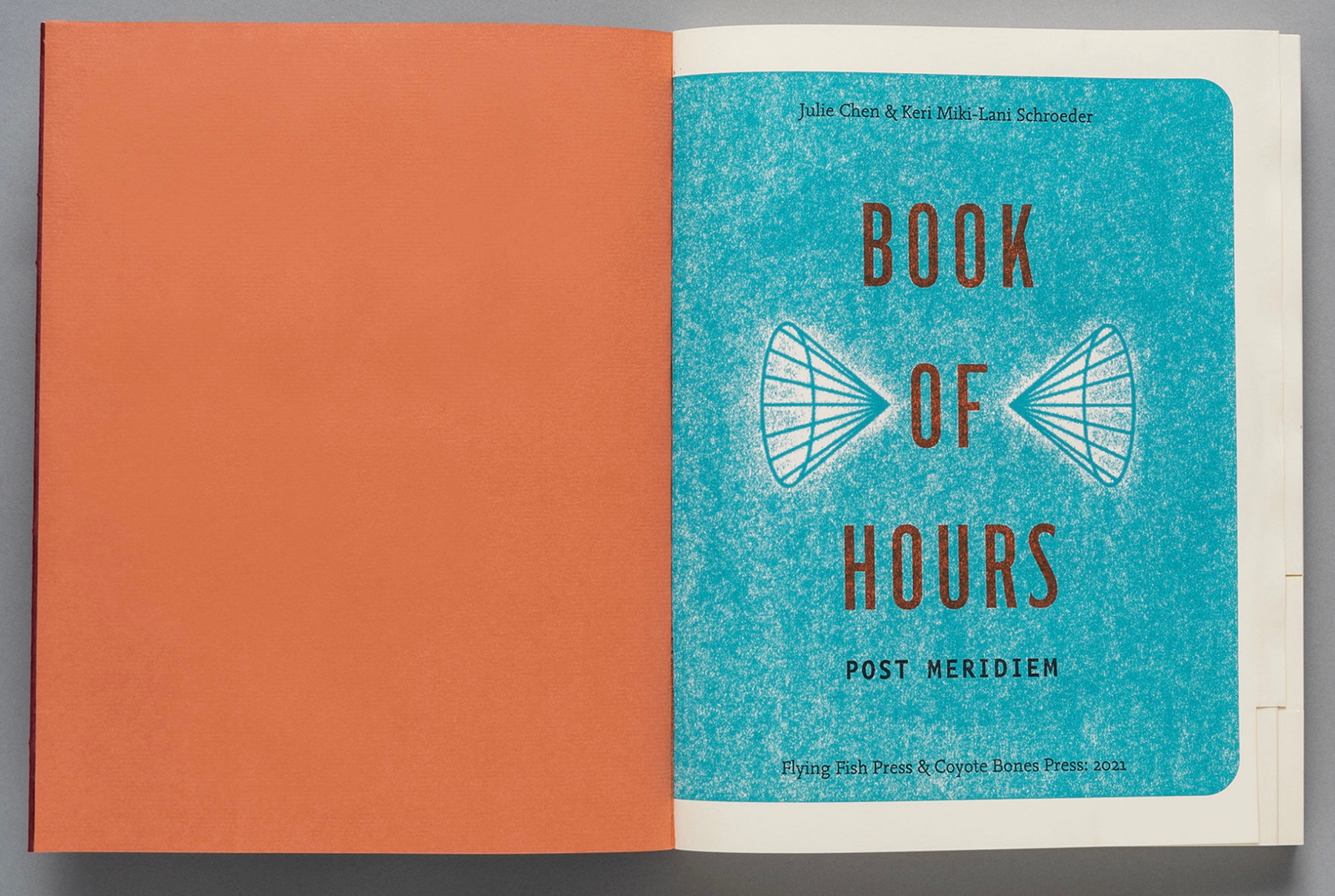 “Book of Hours was designed and created by Julie Chen & Keri Miki-Lani Schroeder. This long-distance collaboration, between California and Texas, took place during the 2020-21 pandemic. The format of Book of Hours is known as a blow book, a historical structure originally designed as a magic trick which allows the presenter to show completely different visual sequences of pages within the same book. … The first and last sequences on each side of the book were designed by the two artists collaboratively, and the other eight sequences were designed individually by each artist. …” — Colophon.