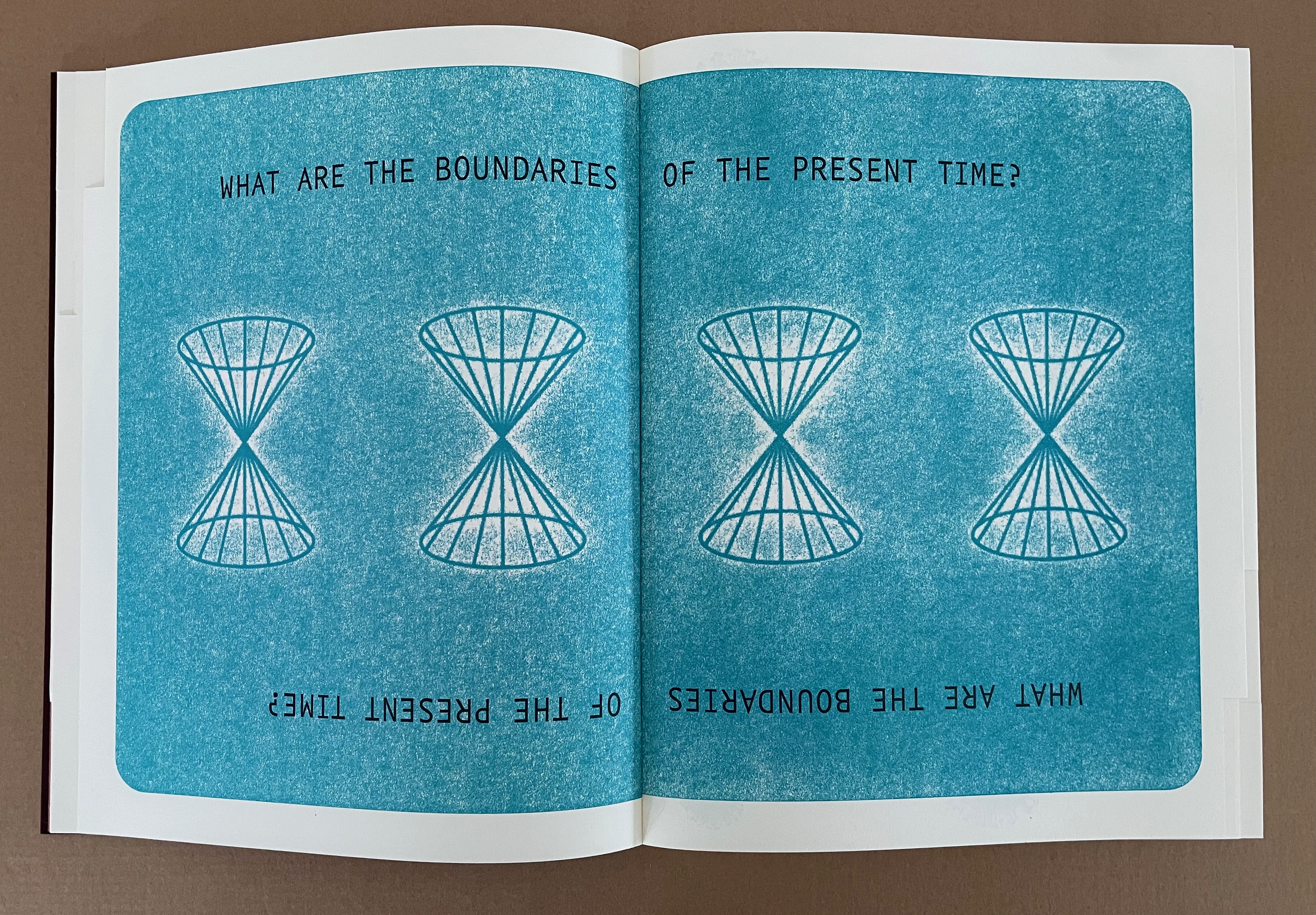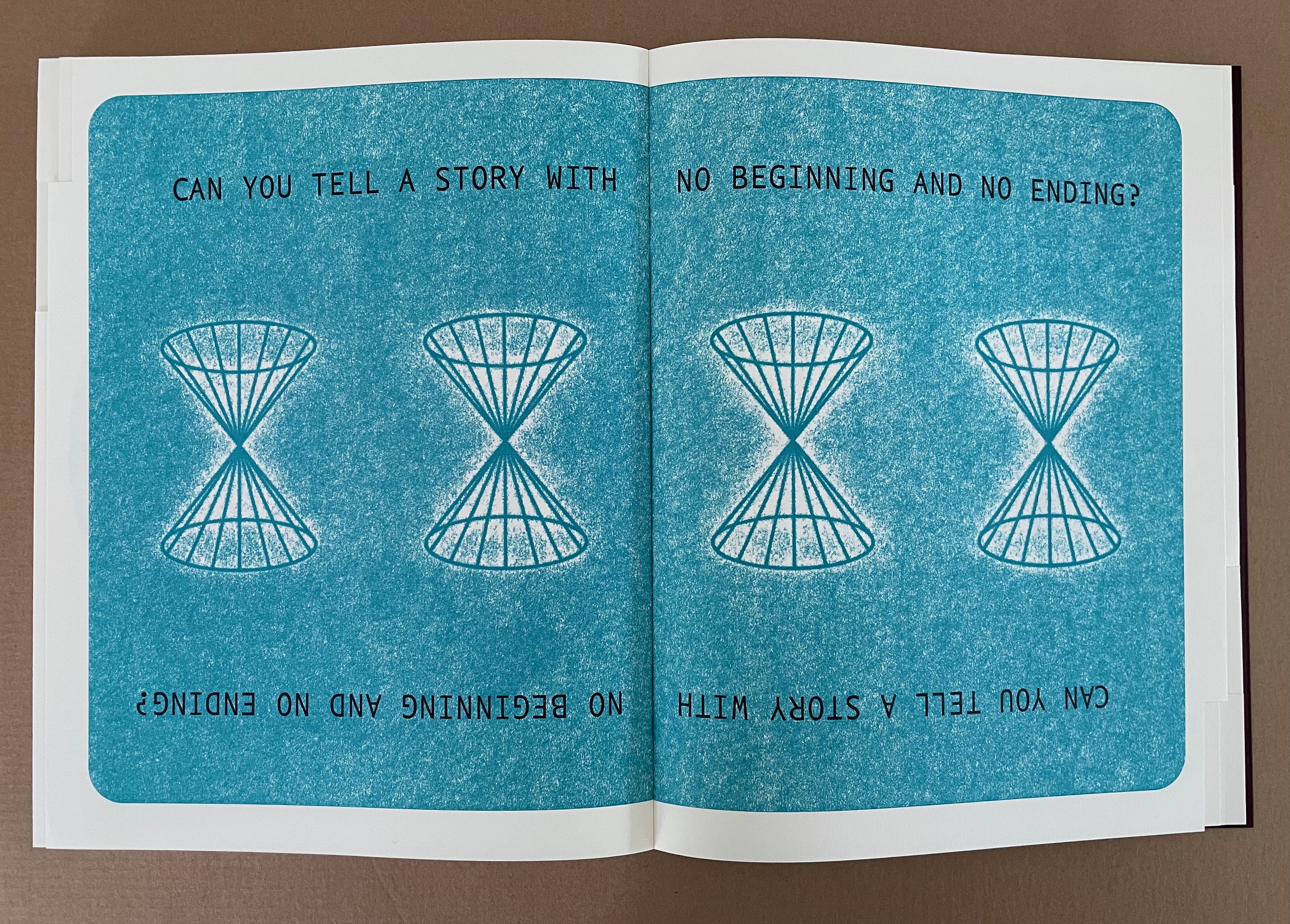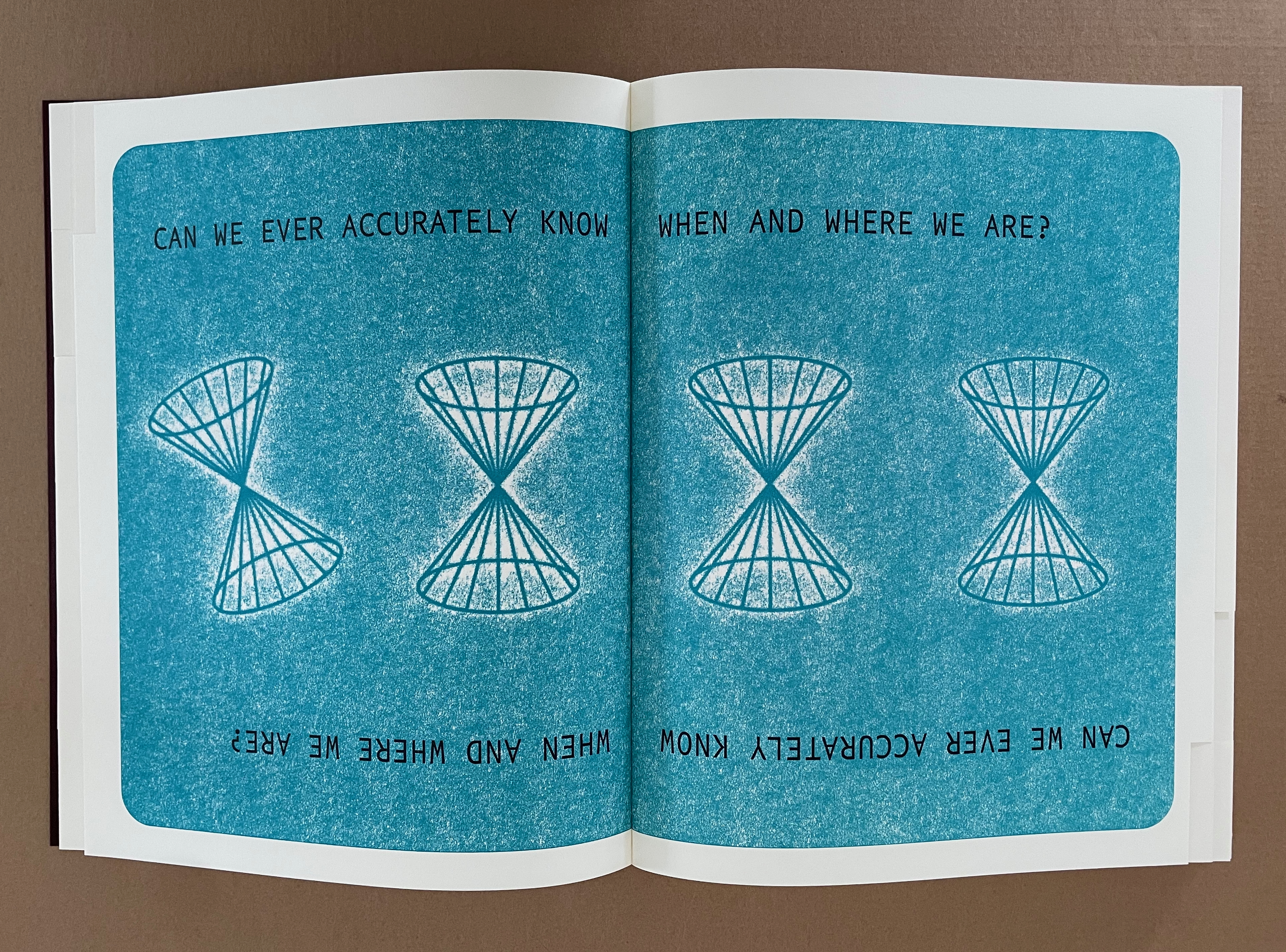 Each spread presents a perplexing question related to time and space; for example, “Can you tell a story with no beginning and no ending?” and “Does time flow in only one direction?” The question is printed right side up at the top of the spread and upside down at the bottom of the spread. So if you turn the book from the AM side to the PM side to riffle the pages, the AM side’s last question becomes the PM side’s first question, and on the AM side, the light cones rotate clockwise, and on the PM side, they rotate anti-clockwise.
