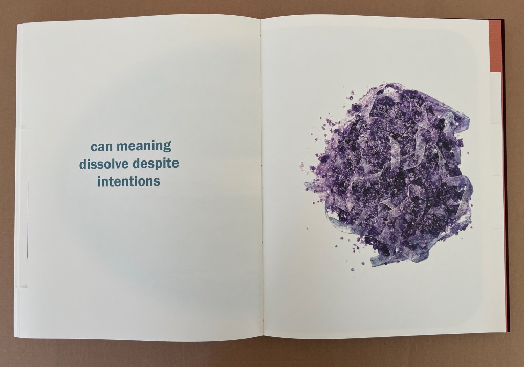 The fifth sequence on both the AM and PM sides seems to seek solace. The AM side seeks it in photographs of hands outstretched to one another. On the PM side, the search is more fraught, turning to language and its relation to thought, reality/the material, the substance of meaning. Across from this are images of a crumpled translucent ribbon bearing indecipherable sentences and attracting black, violet and crystalline debris like flies to strips of flypaper, until the ribbon and words are no longer perceptible.