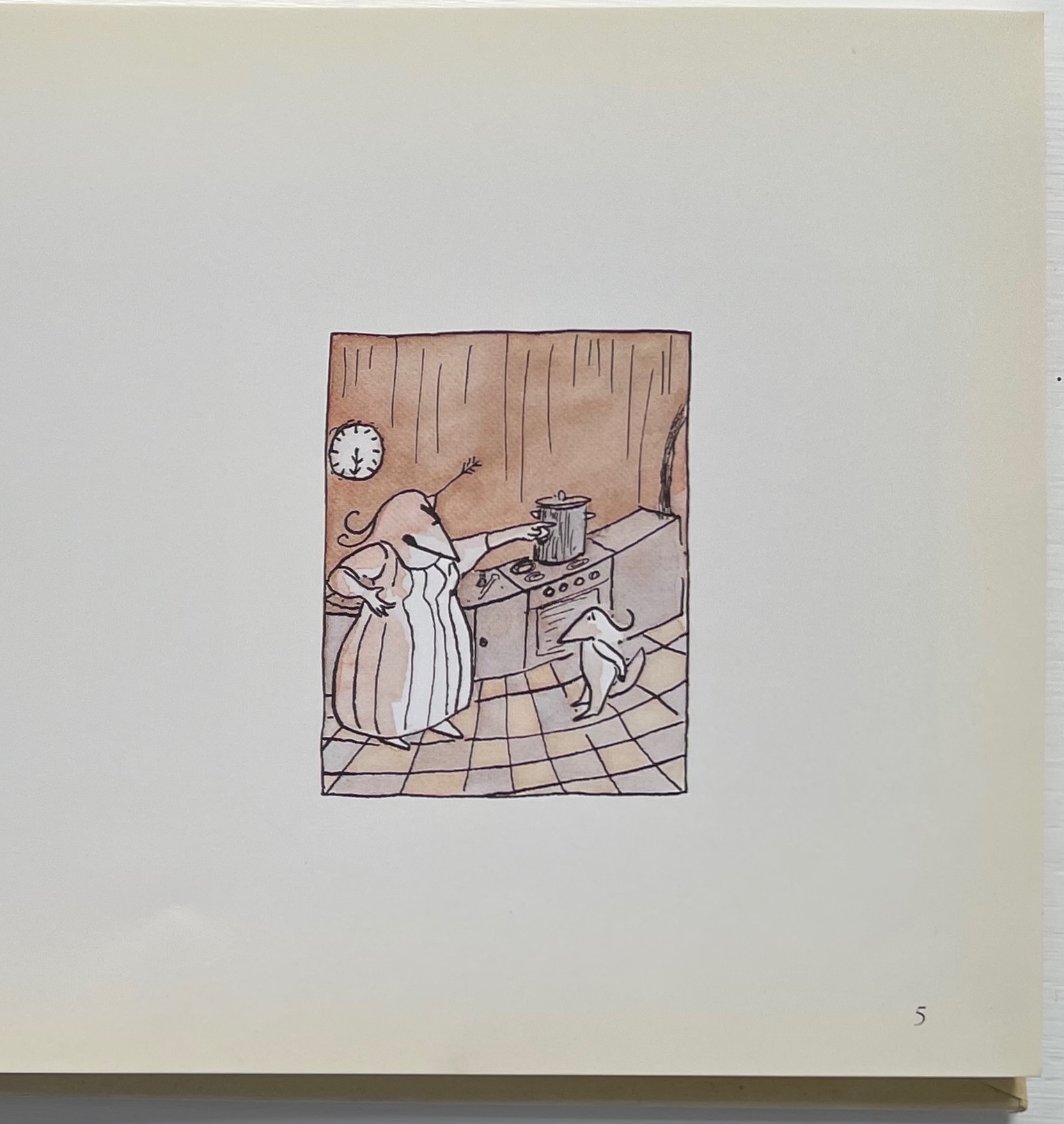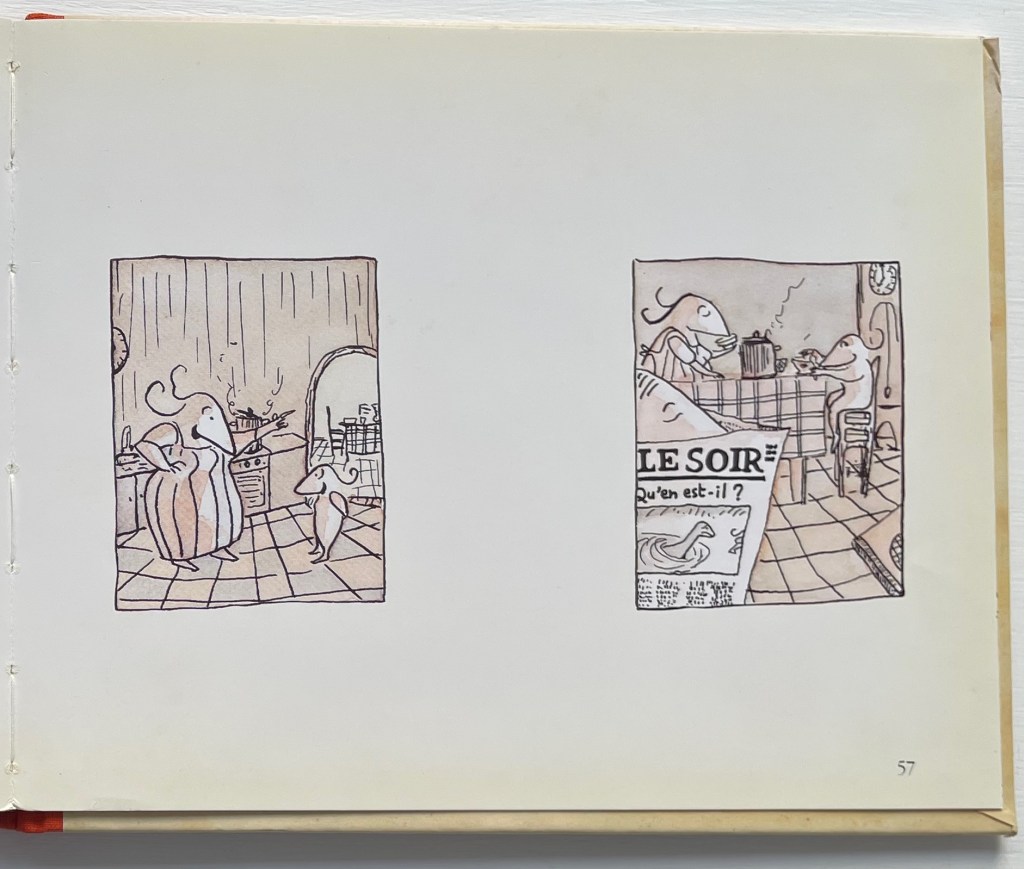 While Papa has his nose in the newspaper, Maman enjoys a peaceful evening at the table with their little one, whose sidelong look at us wordlessly comments on the only text in the story besides its title, the newspaper headline Qu’en est-il?, which translates as “What’s going on?”